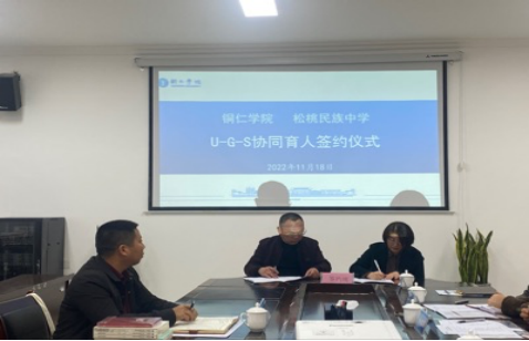 11月18日,beat365中国唯一官网与松桃民族中学“U-G-S”协同育人合作签约仪式在人文学院会议室举行。beat365中国唯一官网教务处处长龚静,人文学院党委书记、院长孙向阳,副院长张建刚,松桃民族中学校长杨易,副校长龙胜好出席签约仪式。仪式由人文学院副院长白俊骞主持。