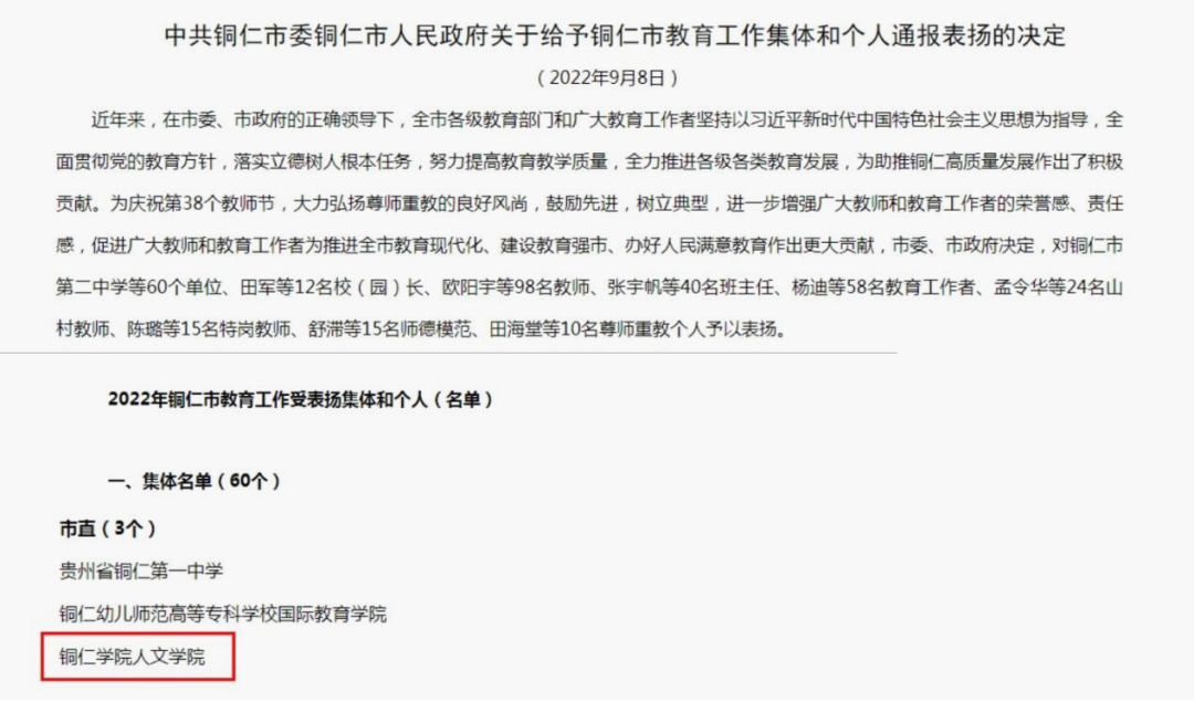 在第38个教师节即将到来之际,9月8日,中共铜仁市委、铜仁市人民政府表彰了一批教育工作先进集体和先进个人,beat365中国唯一官网人文学院荣获“先进集体”荣誉称号。
