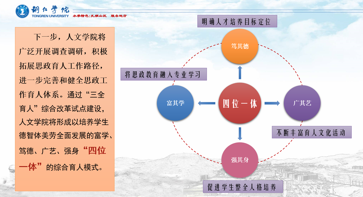 人文学院党委书记、院长孙向阳说,人文学院将以此为契机,坚持以习近平新时代中国特色社会主义思想为指导,全面贯彻落实全国高校思想政治教育工作会议精神,把思政工作重难点和教学科研结合起来,以课程育人、科研育人、实践育人、文化育人、网络育人、心理育人、管理育人、服务育人、资助育人、组织育人等“十大育人”体系为基础,严格按照《普通高等学校院(系)“三全育人”综合改革试点建设标准(试行)》所列建设任务和建设标准,层层压实责任,强化领导体制,完善统筹协调机制,创新实施体系,加大保障力度,整合育人资源,不断推进“三全育人”综合改革,着力构建以培养学生德智体美劳全面发展的富学、笃德、广艺、强身“四位一体”的综合育人模式,形成全员全过程全方位育人新格局。