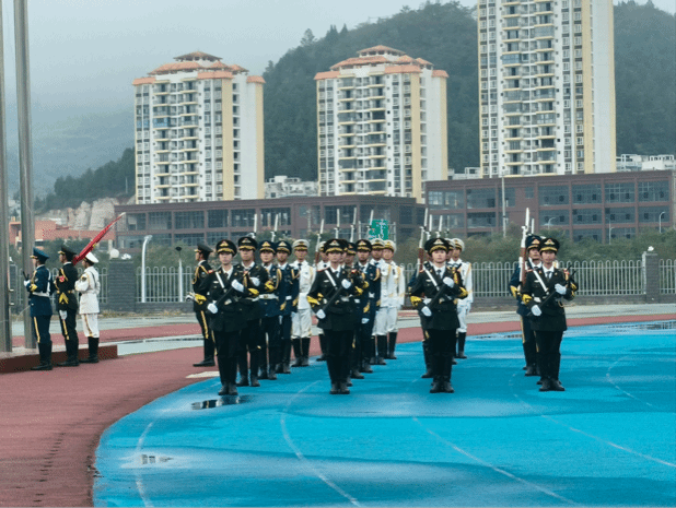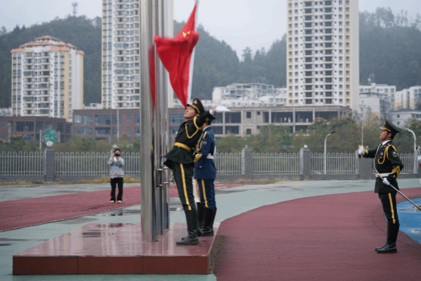 6点55分,护旗手们迈着矫健的步伐,护送着五星红旗走向升旗台。7点整,五星红旗在雄壮激昂的国歌声中冉冉升起,迎风飘扬。全体师生肃立,面向国旗行注目礼,向伟大祖国表达崇高敬意和美好祝愿。