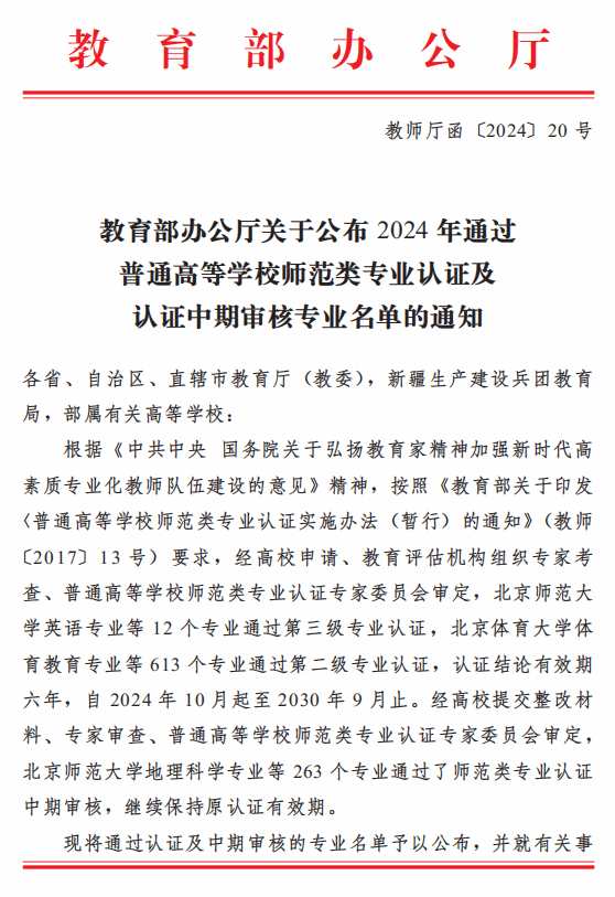 日前,教育部办公厅发布了《关于公布2024年通过普通高等学校师范类专业认证专业名单及中期审核专业名单的通知》(教师厅函【2024】20号),经学校申请、教育评估机构组织专家考查、普通高等学校师范类专业认证专家委员会审定,我院汉语言文学专业通过了师范类专业第二级认定。认证结论有效期六年,自2024年10月至2030年9月。