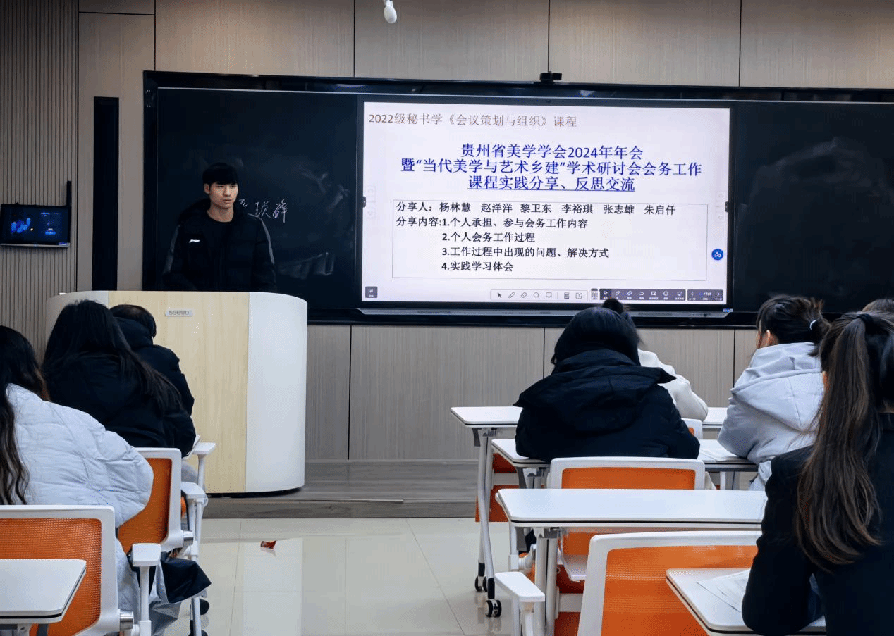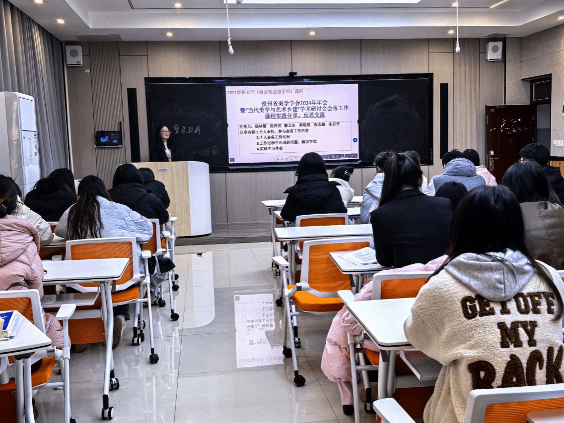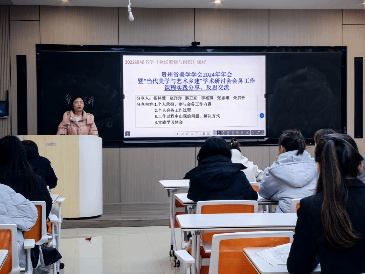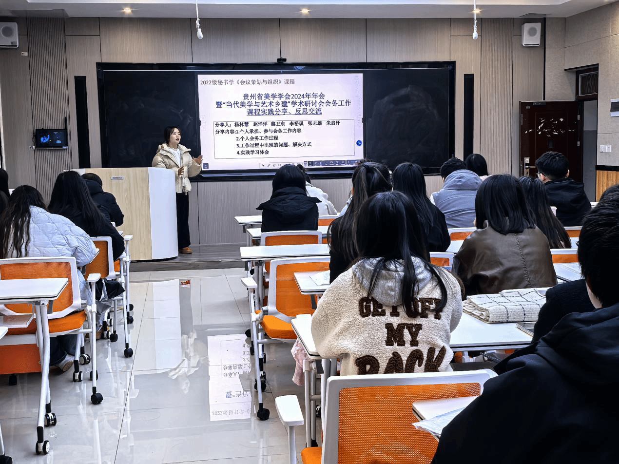12月6日,2022级秘书学专业在会议策划与组织课程任课教师杨雪的组织下,围绕贵州省美学学会2024年年会暨“当代美学与艺术乡建”学术研讨会开展了会务工作案例实践分享、反思交流活动。