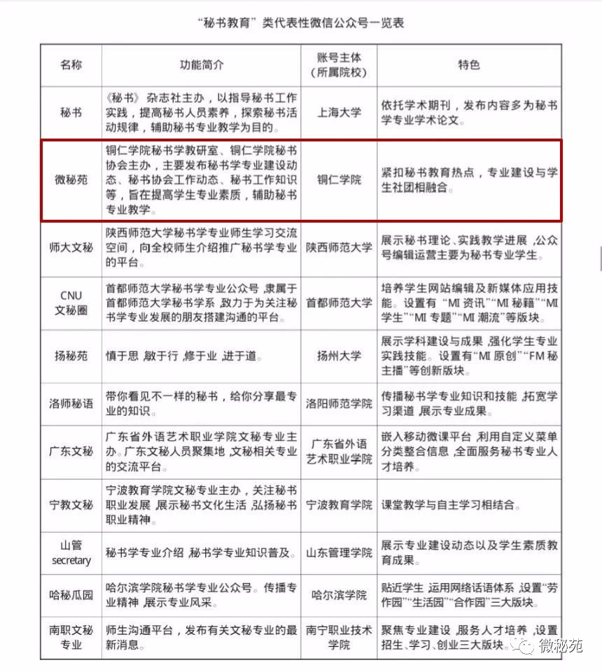 荆州职业技术学院张云婷老师在《微信公众号在秘书教育中的应用》(《秘书之友》2018年第6期)认为:“微秘苑”推送内容涉及秘书专业建设、秘书教育教学、教学实践成果展示,是“秘书教育”类代表性微信公众号之一。