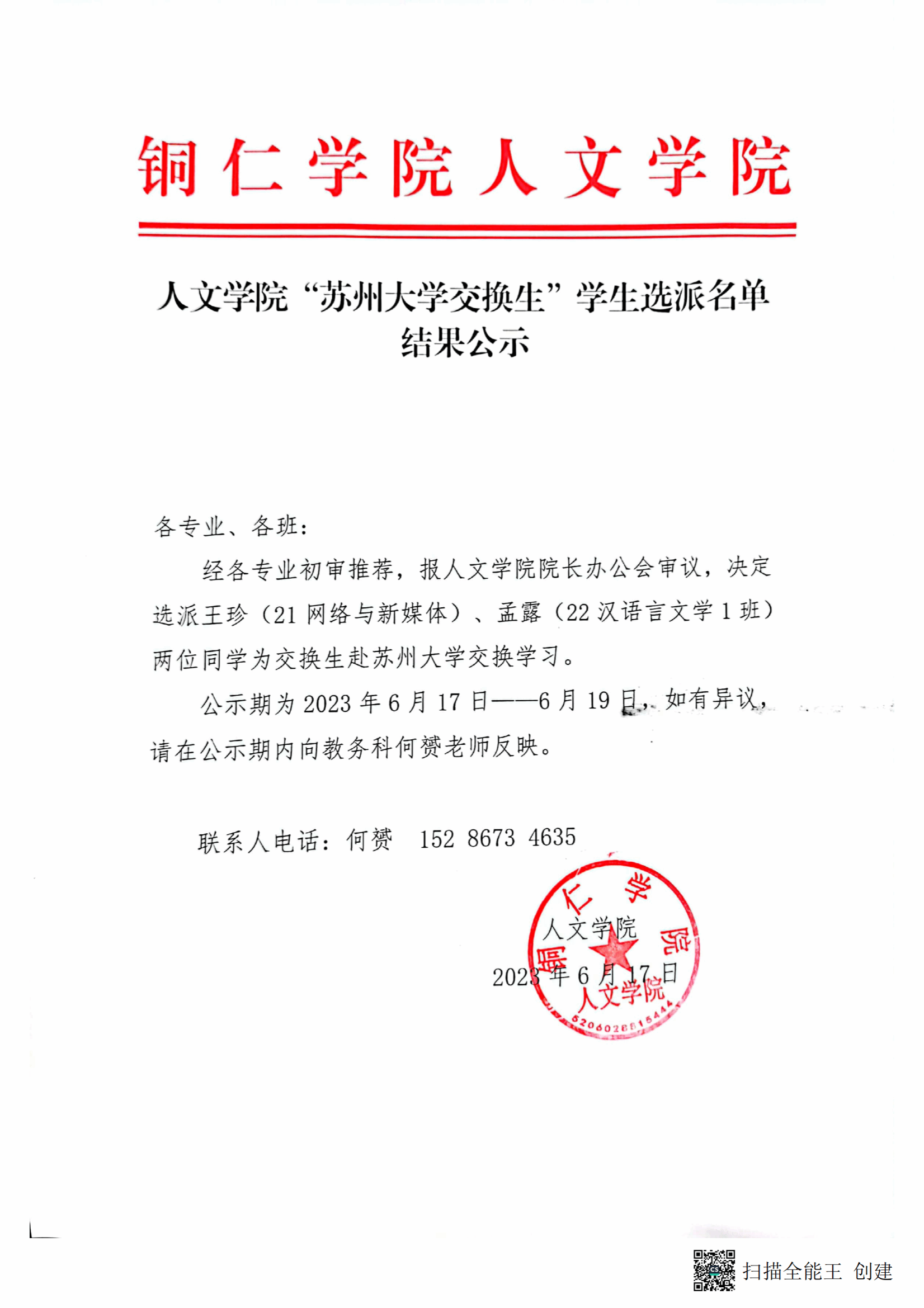 人文学院“苏州大学交换生”学生选派名单结果公示