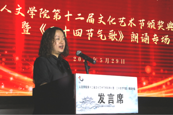 5月29日,人文学院第十二届文化艺术节闭幕颁奖典礼暨《二十四节气歌》朗诵专场在人文生态馆举行副校长石维党委宣传部部长叶丹、教务处处长龚静教授党委学工部副部长刘玉康、团委副书记张朝飞人文学院党委书记、院长孙向阳党委副书记杨雪副院长张建刚、蒋小红出席了颁奖典礼