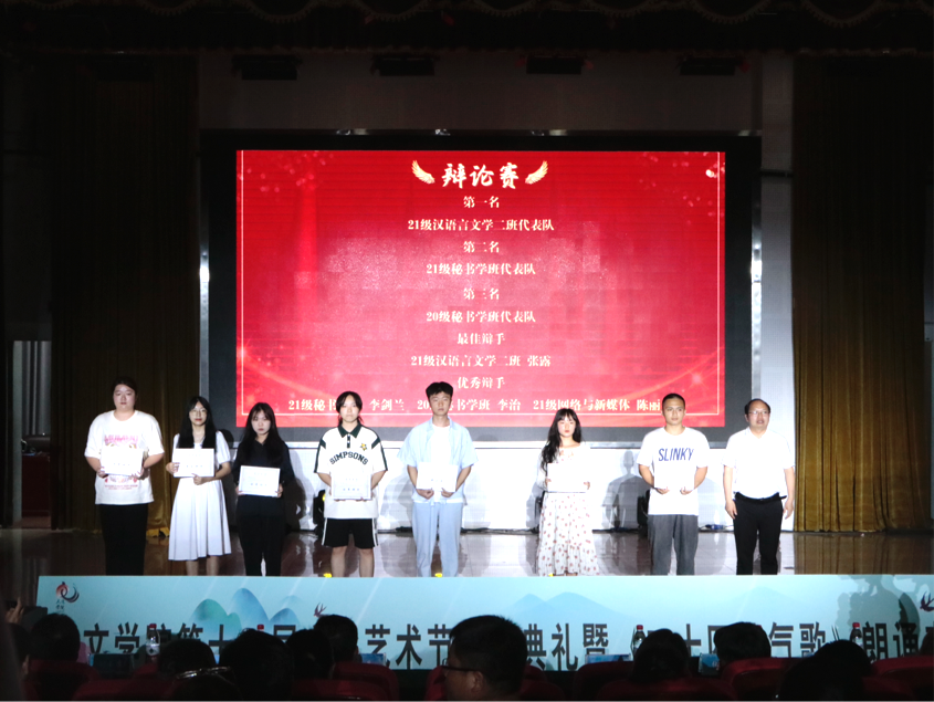 人文学院第十二届文化艺术节4月9日启动至闭幕,历时近两个月。先后举办了最美班级文化墙评选、春日Vlog&摄影、PPT制作大赛、三行情诗征集、手工创意制作大赛、辩论赛活动参与人数达730人次,其中各单项赛事共评选出一等奖15人,二等奖28人,三等奖38人出席颁奖典礼的嘉宾为获奖人员颁奖并合影留念。