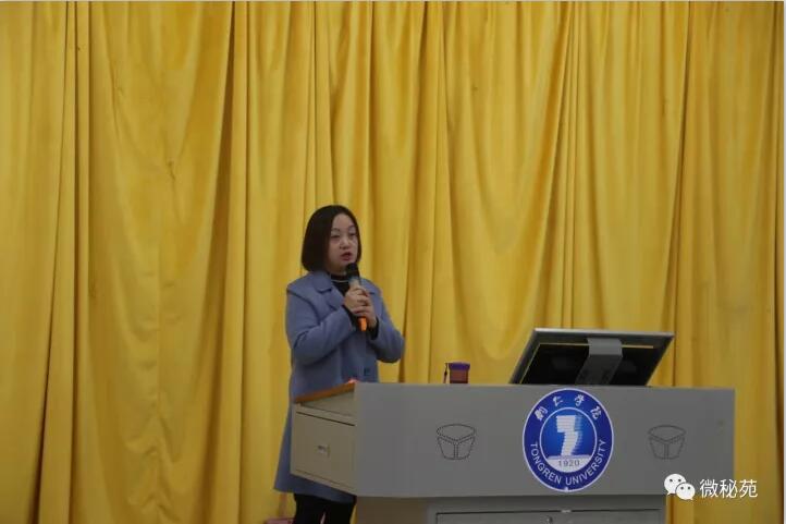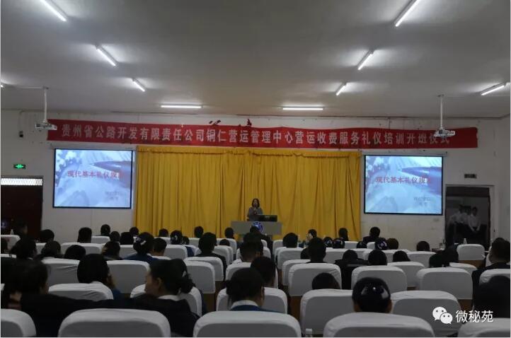 11月16日上午,贵州省公路开发有限责任公司铜仁营运管理中心员工营运收费服务培训班在beat365中国唯一官网博思楼206教室举行开班仪式,仪式过后即举行了礼仪知识培训。培训旨在进一步规范员工礼仪,提升个人修养及岗位意识,提高工作能力及服务水平,塑造良好企业形象。秘书学教研室教师、全国商务秘书职业技能大赛评委杨雪为培训班140余名学员授课。