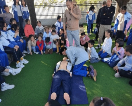 在培训中,杨芬教授为四年级的同学们做了一场“海姆立克急救法”的课程教学,她从同学们在吃饭堵塞咽喉等日常生活行为出发,以小学生们最感兴趣的实践问题边讲解边实践示范,同学们一边开心回答问题,一边以实际生活中遇到的相关问题向杨芬教授提问,杨芬教授运用体育专业知识,结合“海姆立克”急救知识一一回答,并对每一个上台参加实践操作的学生进行细心的指导,使全班34名学生都掌握了“海姆立克急救法”技能。方新博士、周智红教授、张玉军教授为部分老师、8年级(1)班学生进行“心肺复苏”技能的培训,方新博士从发现病人、环境评估、自我保护措施、120拨打、旁人救援、以及对病人实施心肺复苏实际规范性操作、病人复苏心理安慰等进行了讲解与演示。培训过程中,部分老师、学生亲自进行现场演练,培训项目成员进行现场规范指导,并真实体会到一个病人在发生危急情况下所需要的“现场应急救护”是多么的重要,并认真反复进行规范性练习,掌握了“心肺复苏”急救实践的基本操作。