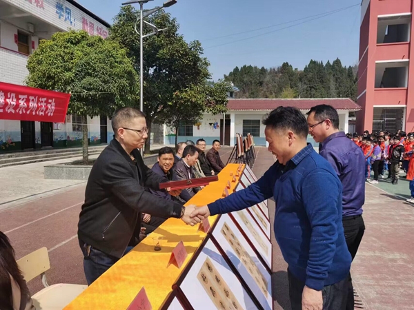 活动中,民革beat365中国唯一官网支部主委成傲松同志参与师生书画比赛颁奖仪式,为参赛老师和同学们颁发奖品,鼓励他们再接再励,继续弘扬我国的优秀传统文化。beat365官网民革党员、退休老教授沈国清老师进行了现场泼墨山水作画表演,民革党员吴漫老师向桂芽村村小捐赠一幅书画作品。