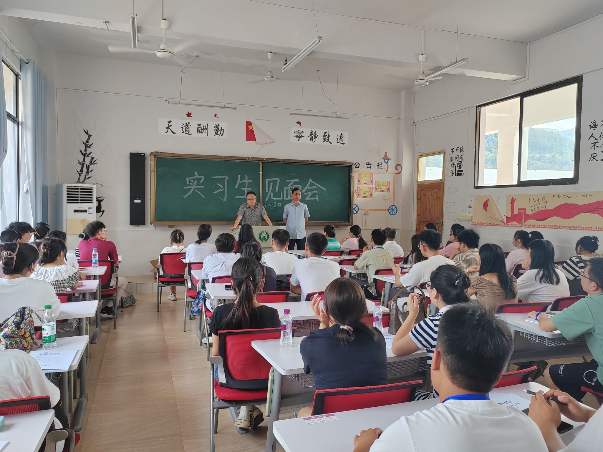 9月3日,在乌江学院402教室召开了实习生见面会,会议由指导组组长郑刚主持,参加会议的有各学科实习生53人,乌江学院全体教师。