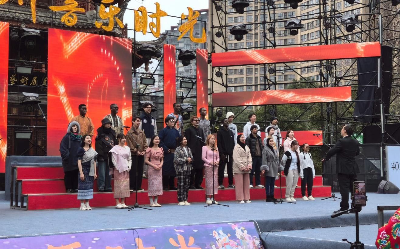 这是一支来自14个国家的国际生组成的合唱团,以独特的跨国阵容成为全场焦点。走进活动现场,能清晰感受到多元文化碰撞的鲜活气息。不同肤色的学生并肩站在红色舞台上,虽带着赛前的些许紧张,却难掩眼中对音乐的热忱。他们中有人身着家乡特色服饰,有人搭配了简约的休闲装。形象各异的装扮背后,是整齐划一的演唱姿态。当伴奏声响起,尽管母语不同,他们却用流利的中文演唱《送别》,优美的旋律和歌声在古色古香的舞台建筑与多彩灯光的映衬下回荡。既有国际范儿的灵动,又融入了贵州本土音乐的醇厚韵味,现场工作人员与观众不时传来阵阵赞叹。