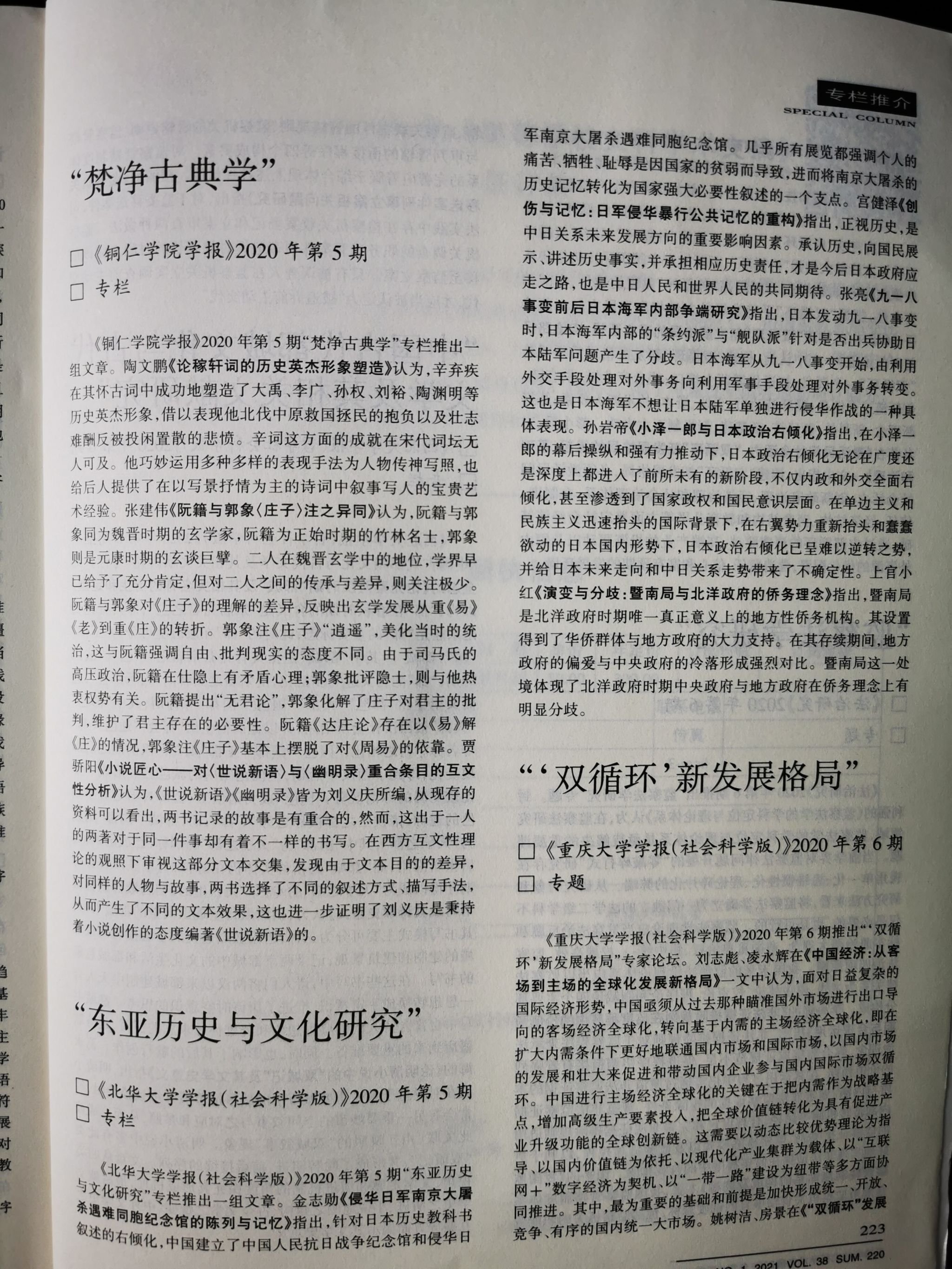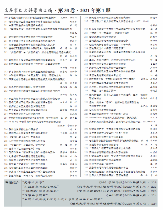 2020年第5期,该栏目重点推出《论稼轩词的历史英杰形象塑造》《阮籍与郭象<庄子>注之异同》《小说匠心——对<世说新语>与<幽明录>重合条目的互文性分析》三篇文稿。其中,中国社会科学院文学所研究员,博士生导师陶文鹏先生的《论稼轩词的历史英杰形象塑造》一文被中国人民大学书报资料中心复印报刊资料《中国古代、近代文学研究》2021年第2期全文转载。