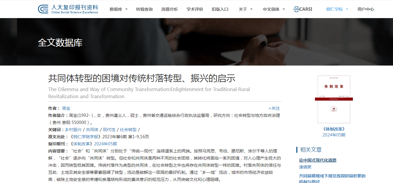 《共同体转型的困境对传统村落转型、振兴的启示》一文被人大复印资料《体制改革》2024年第5期全文转载