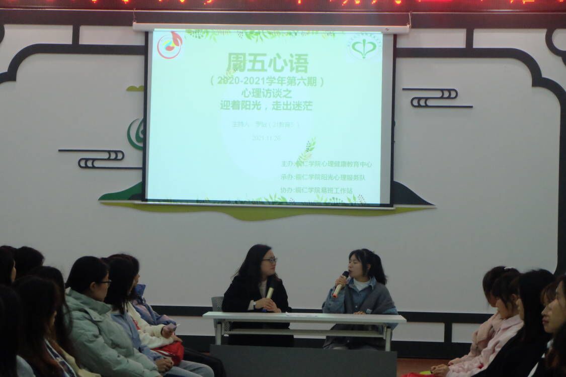 11月26日晚,由beat365官网心理健康教育中心主办、阳光心理服务队承办的第六期周五心语——心理访谈之《谁的青春不迷茫》在多功能室如期开展。本期活动邀请校心理健康教育中心夏冰月老师作为嘉宾,为来自不同学院的40名同学参加活动,活动由21教育5罗怡同学主持。