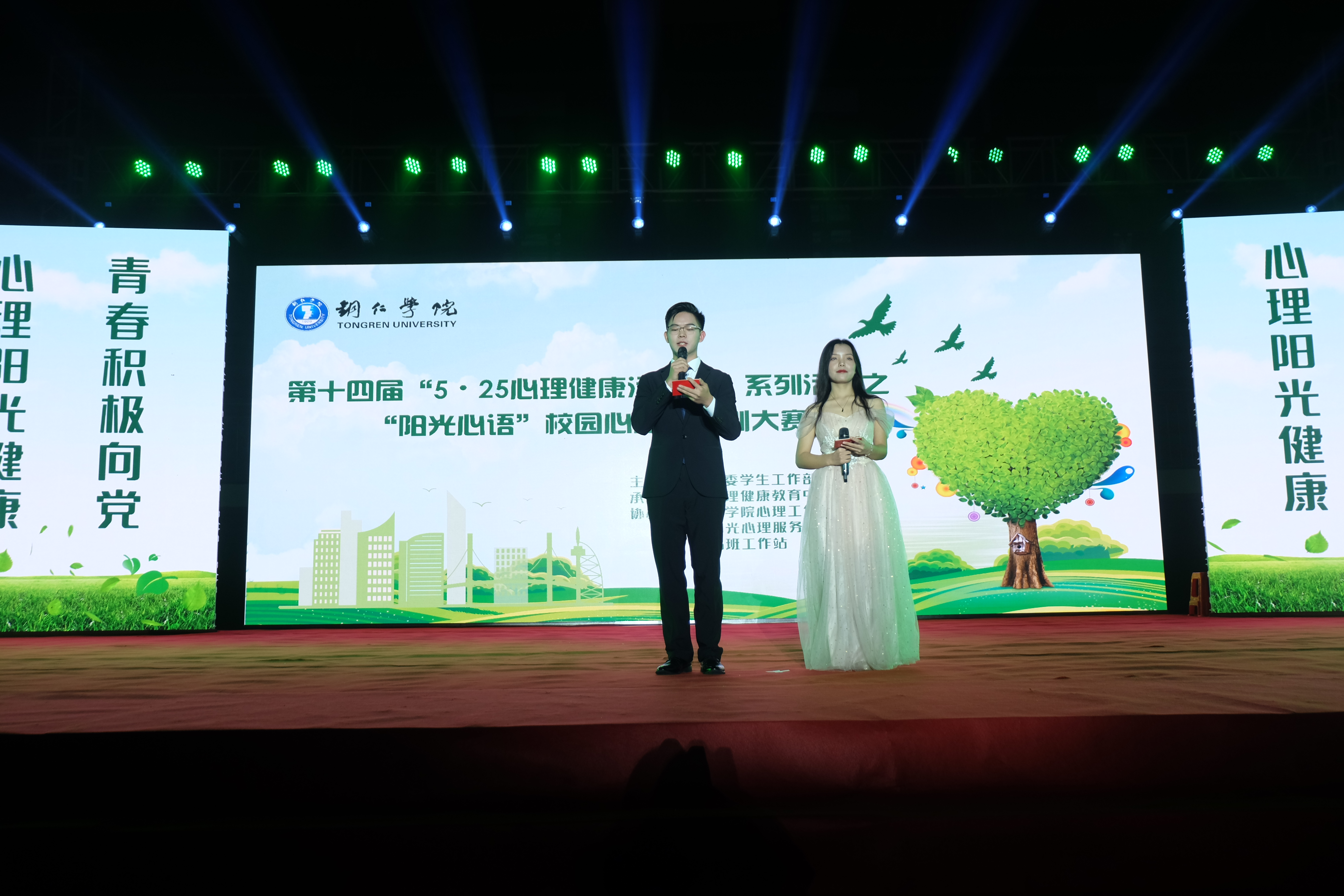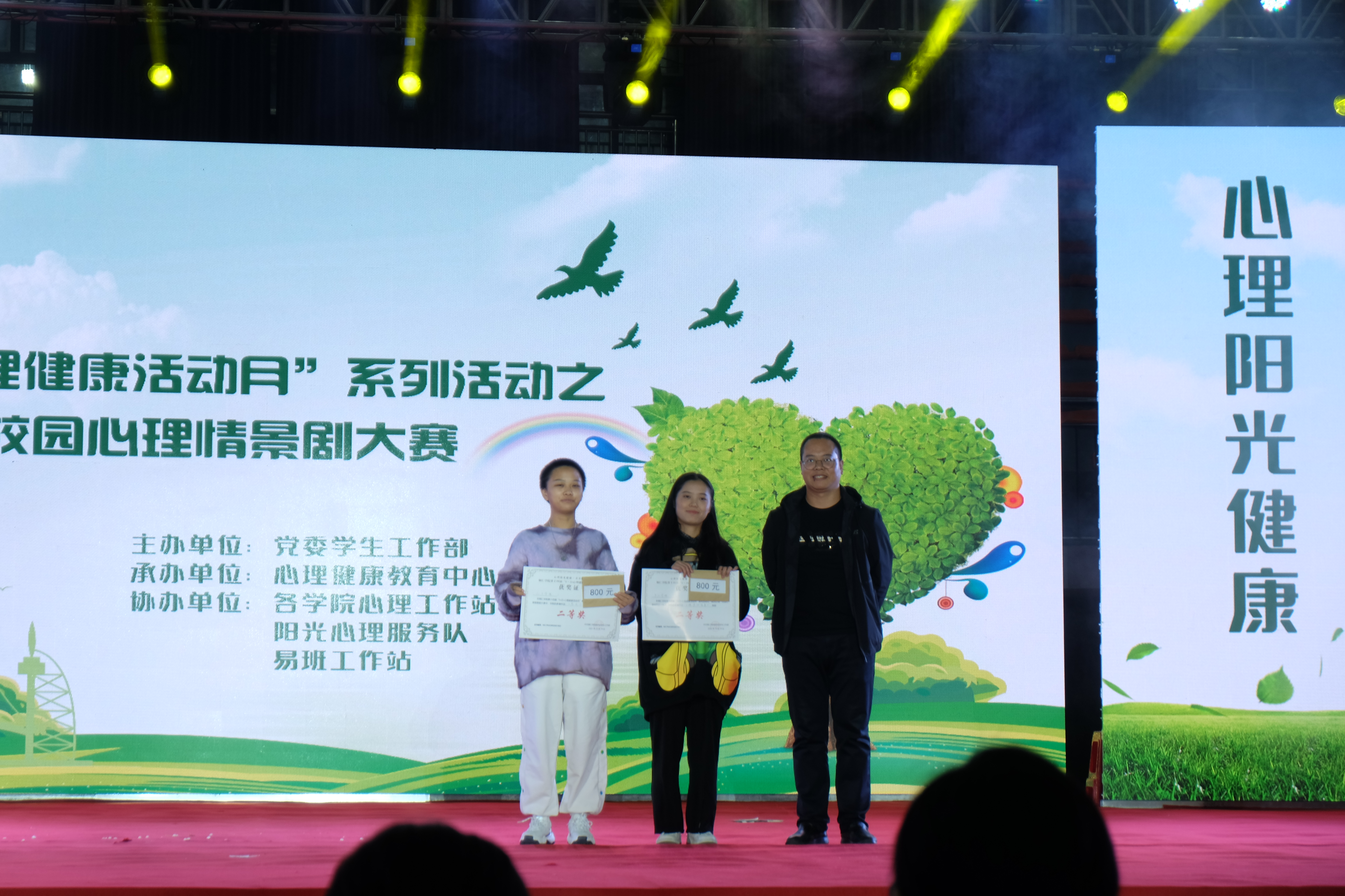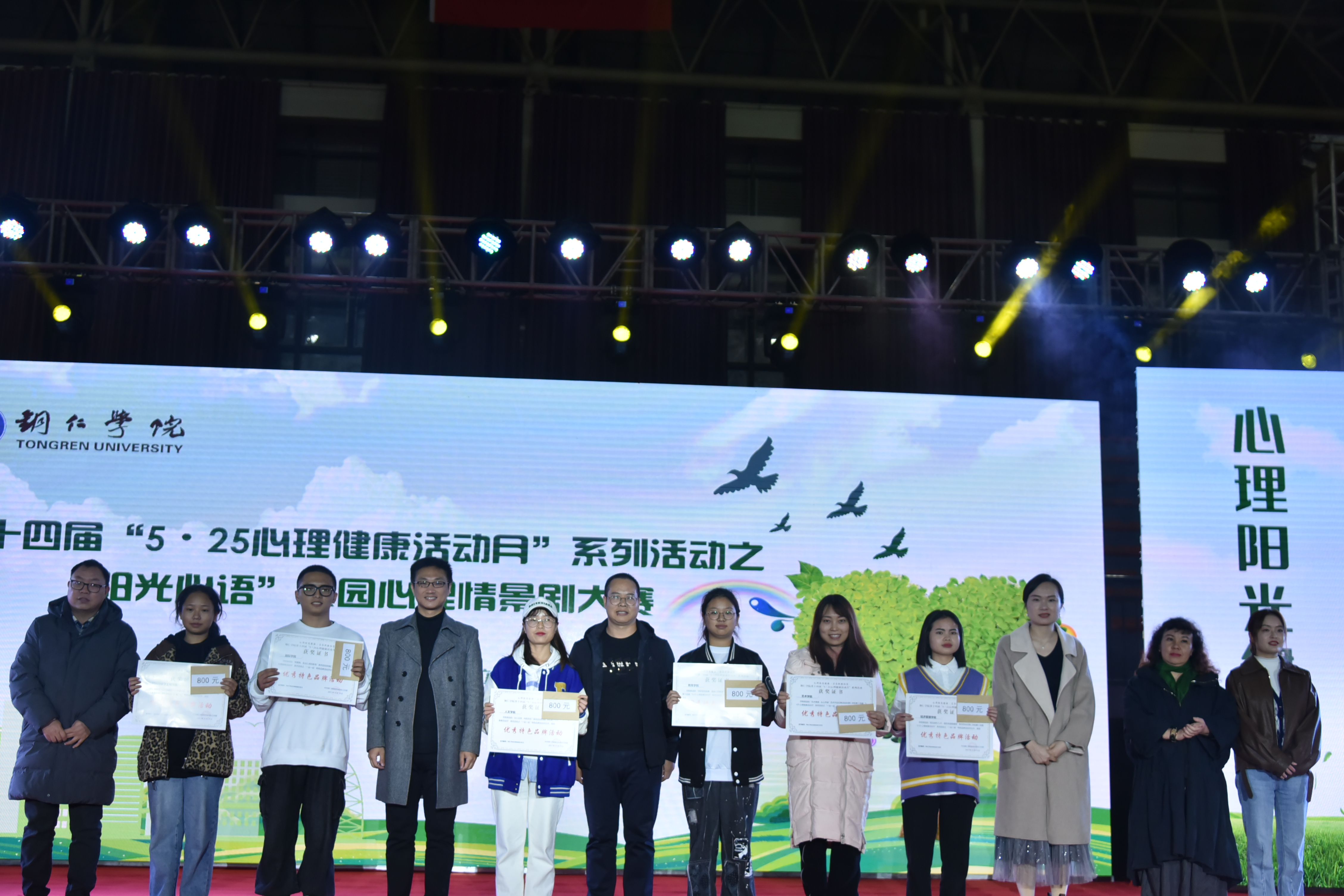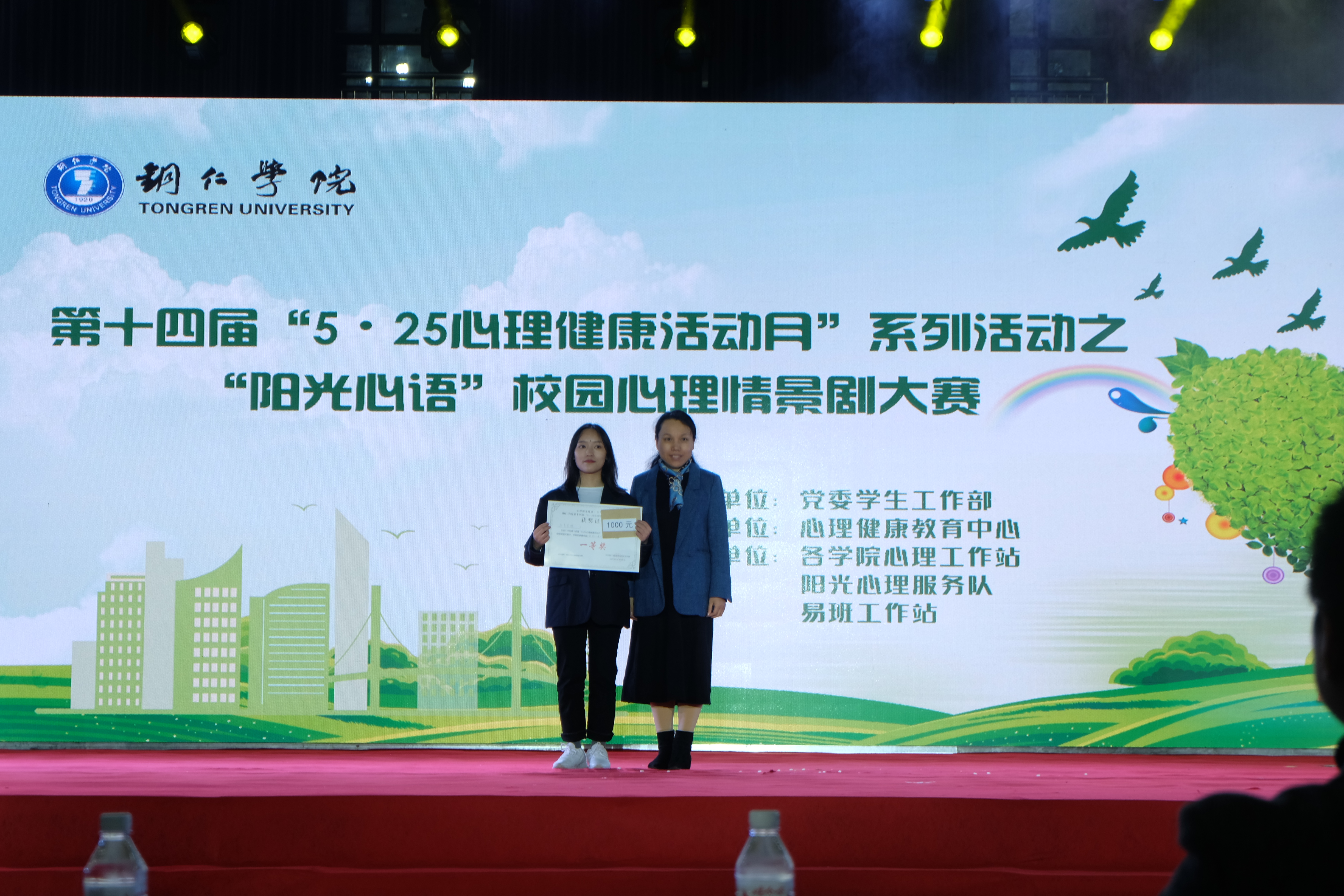 经过紧张激烈角逐,教育学院获一等奖,人文学院、乌江学院获二等奖,国际学院、马克思主义学院、大数据学院或三等奖,来自乌江学院的冯羽同学获得最佳表演奖,来自教育学院的田彩玲同学获得最佳人气奖。相关领导现场为获奖学院和个人颁奖,并为获得本届“5·25心理健康活动月”系列活动之“一站一品”优秀特色品牌活动获奖学院现场颁奖。