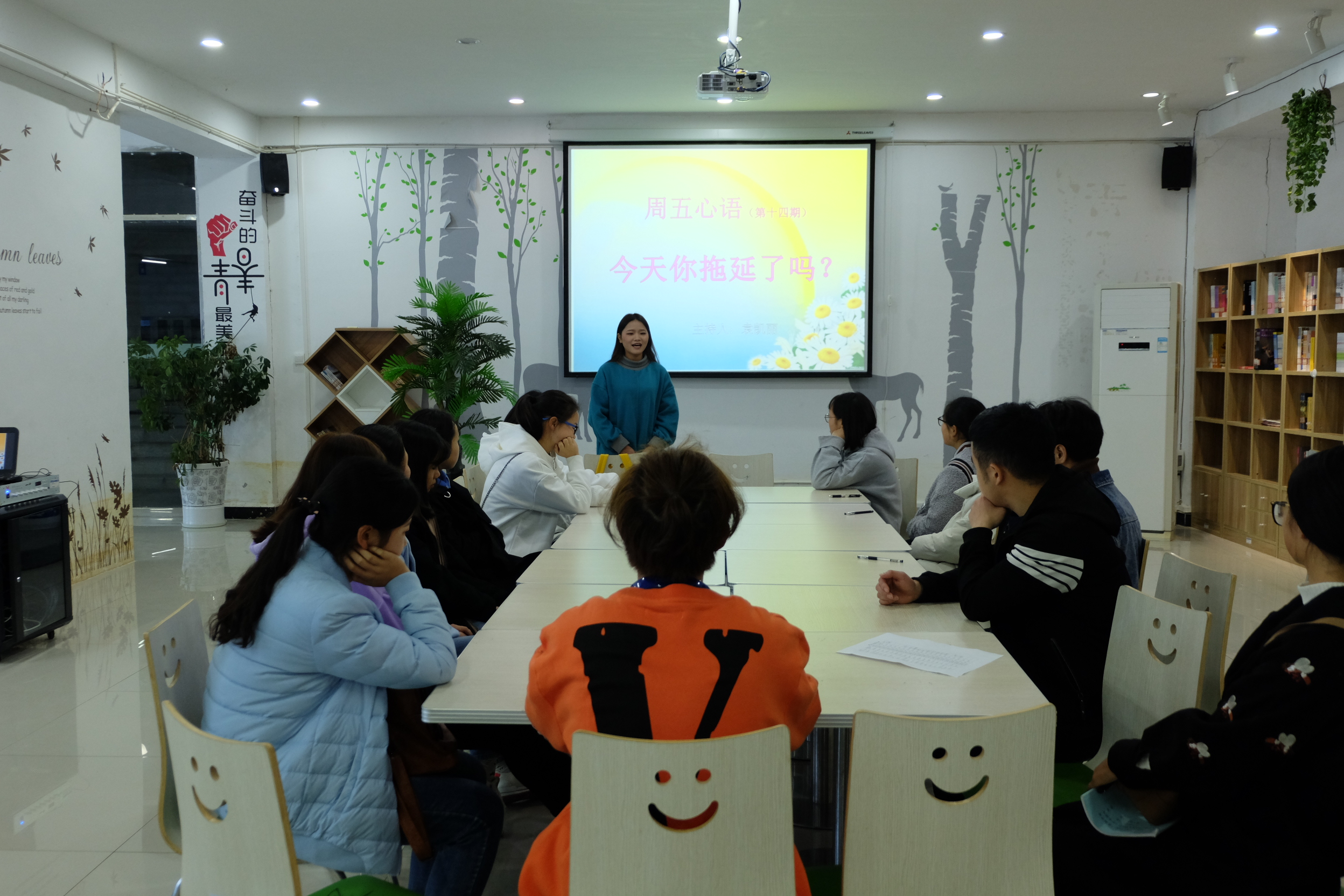 11月23日beat365中国唯一官网心理协会在学生事务服务中心举行第十四期周五心语活动,主题围绕“今天你拖延了吗?”展开讨论,此活动由宣传部袁凯丽主持。来自不同学院的20名同学共同参与完成。