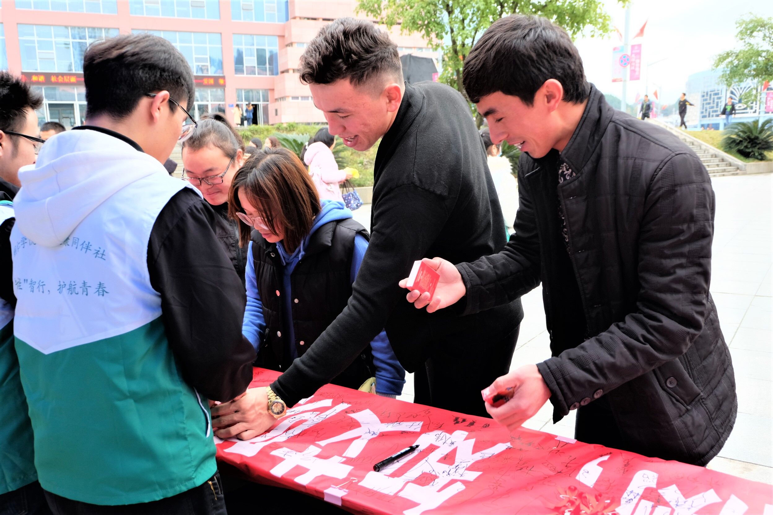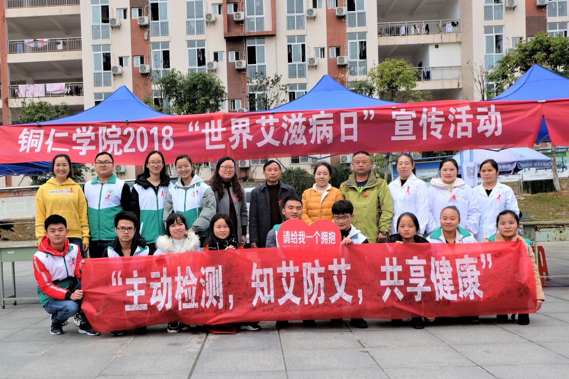 本次出席活动的嘉宾有铜仁市碧江区疾病预防控制中心主任万兆明,校心理健康教育中心专职教师夏冰月,以及碧江区疾病预防控制中心一众医护人员等。活动现场摆放宣传展板,悬挂主题横幅,播放防艾滋病宣传视频等;同时也进行了主动检测、有奖问答、横幅签名、“呼吁拥抱”一系列活动内容。疾病预防控制中心医护人员还为beat365官网学生做HIV病毒检测,同学们都积极参与其中。