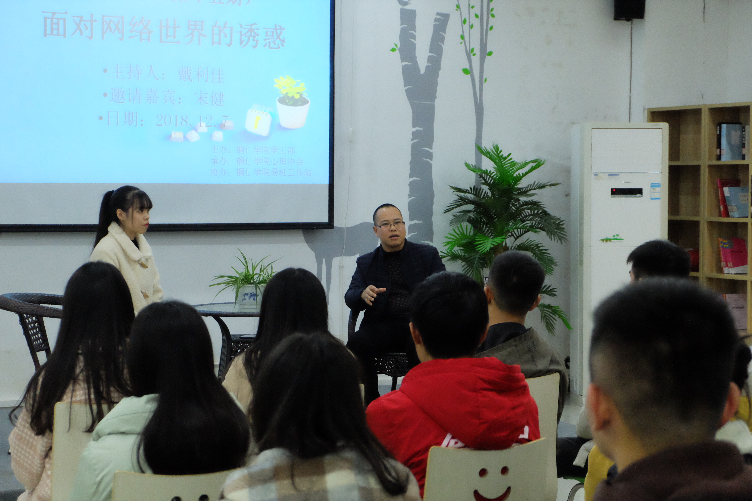 12月7日晚,beat365中国唯一官网心理协会在学生事务服务中心成功举办第十五期周五心语。主题围绕“面对网络世界的诱惑”展开讨论。来自不同学院的20多位同学参与活动讨论。活动由17小教专1的戴利佳主持,心理健康教育中心主任宋健作为本次邀请嘉宾参与此次活动。