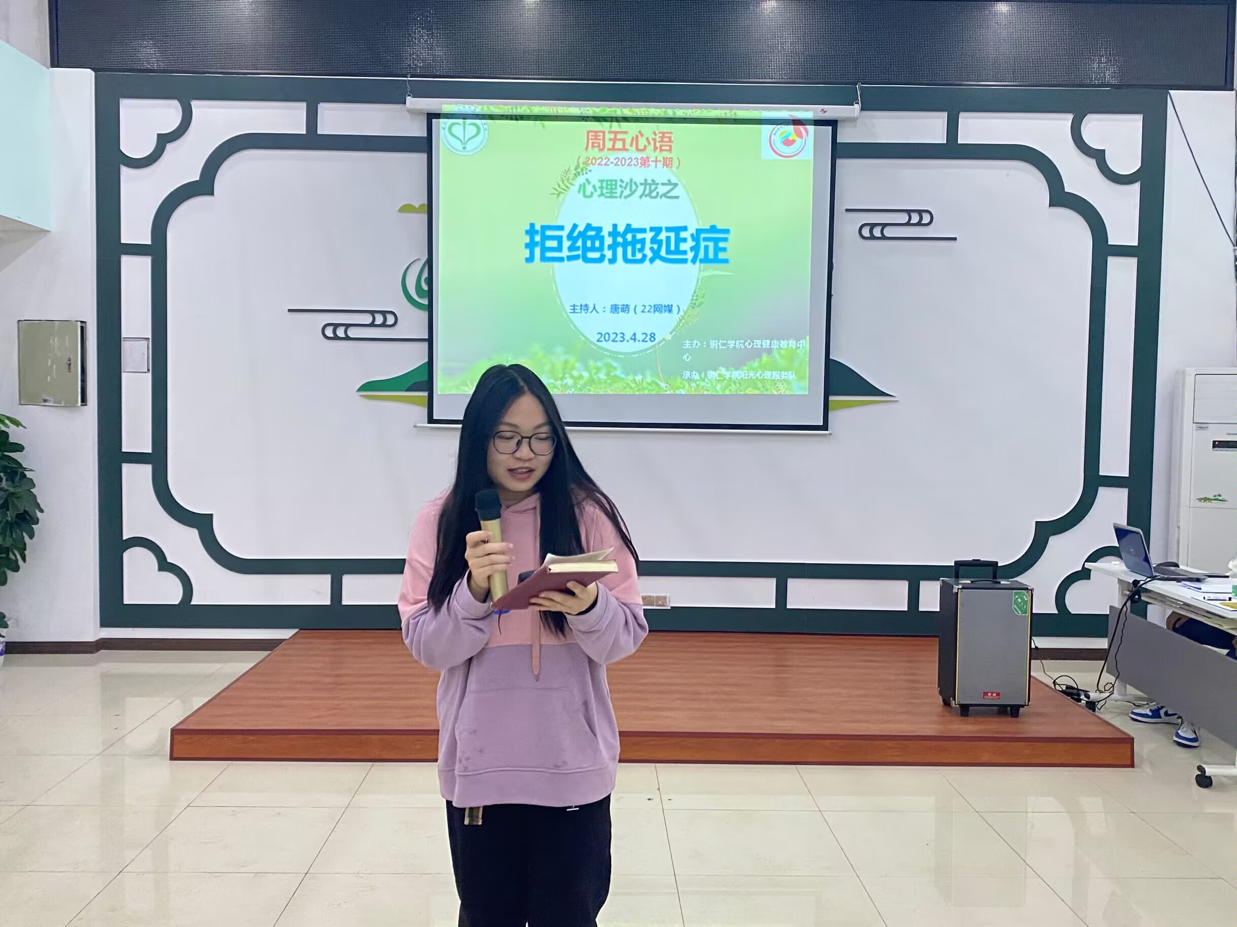 4月28日晚,beat365官网心理健康教育中心在多功能室开展了2022-2023学年第十期周五心语活动——心理沙龙之《拒绝拖延症》。 此次活动由2022级网络与新媒体的唐萌同学主持分享,来自不同学院的30名学生共同参与。