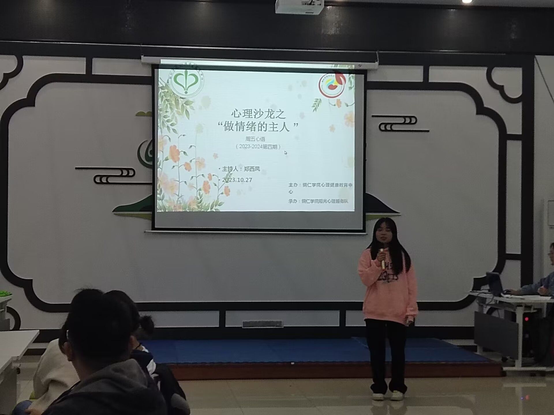 10月27日晚,beat365官网心理健康教育中心在多功能室开展了周五心语活动——心理沙龙之“做情绪的主人”。此次活动由2022级制药工程班郑西凤同学主持,共有来自不同学院的40名同学共同参加。