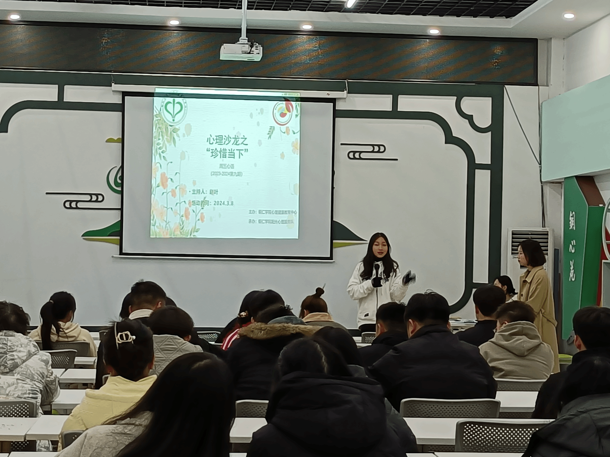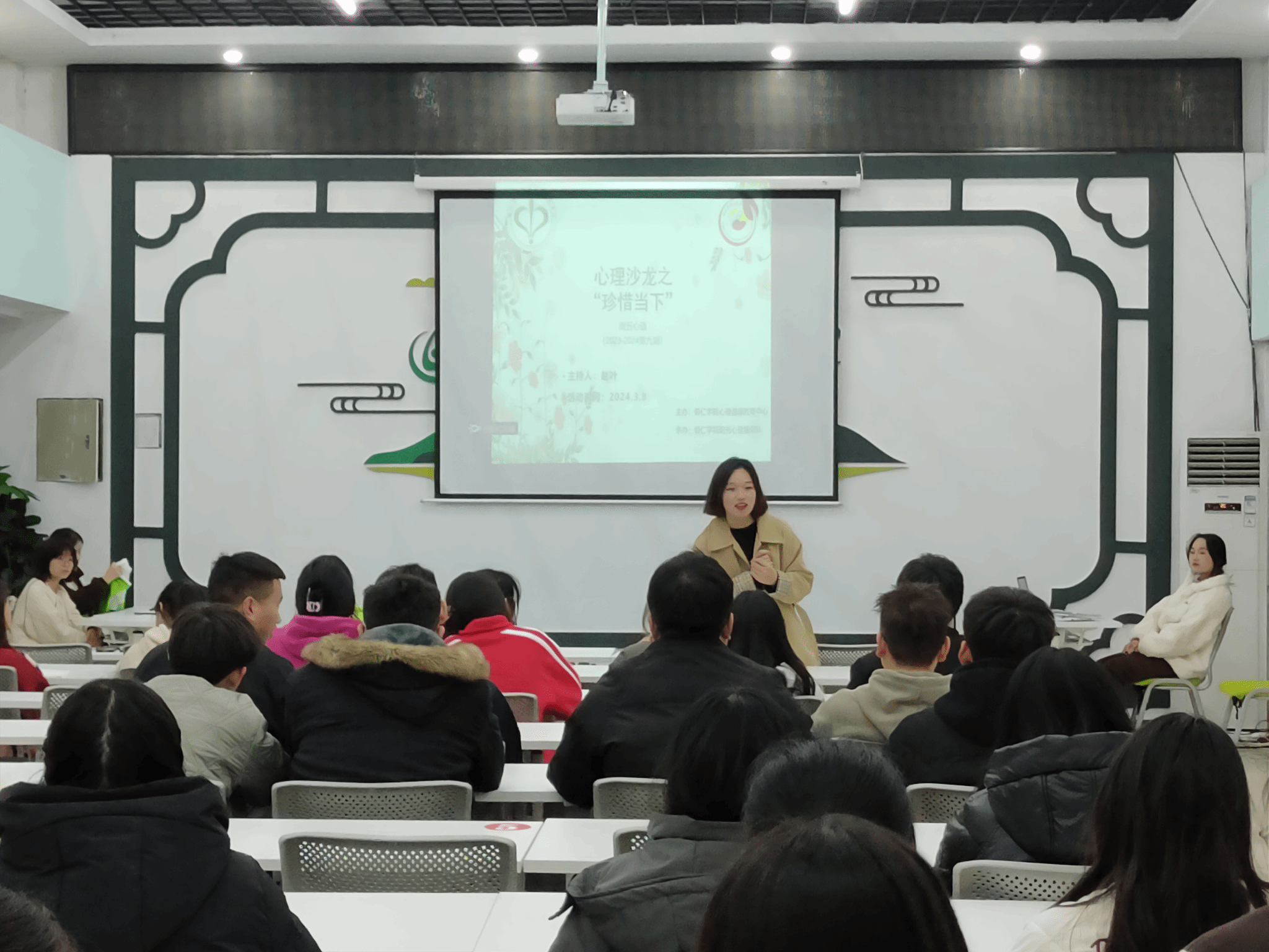 3月8日晚,beat365官网心理健康教育中心在多功能室开展了2023-2024学年第九期周五心语活动——心理沙龙之“珍惜当下”。此次活动由2023级食品科学与工程班赵叶同学主持分享,共有40名来自不同学院的同学参加。