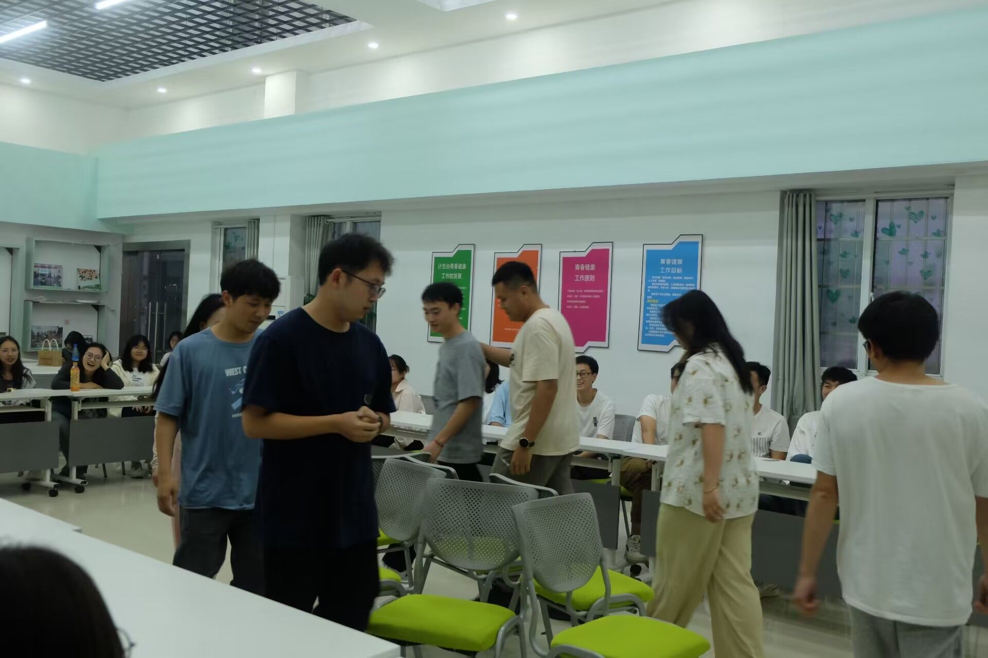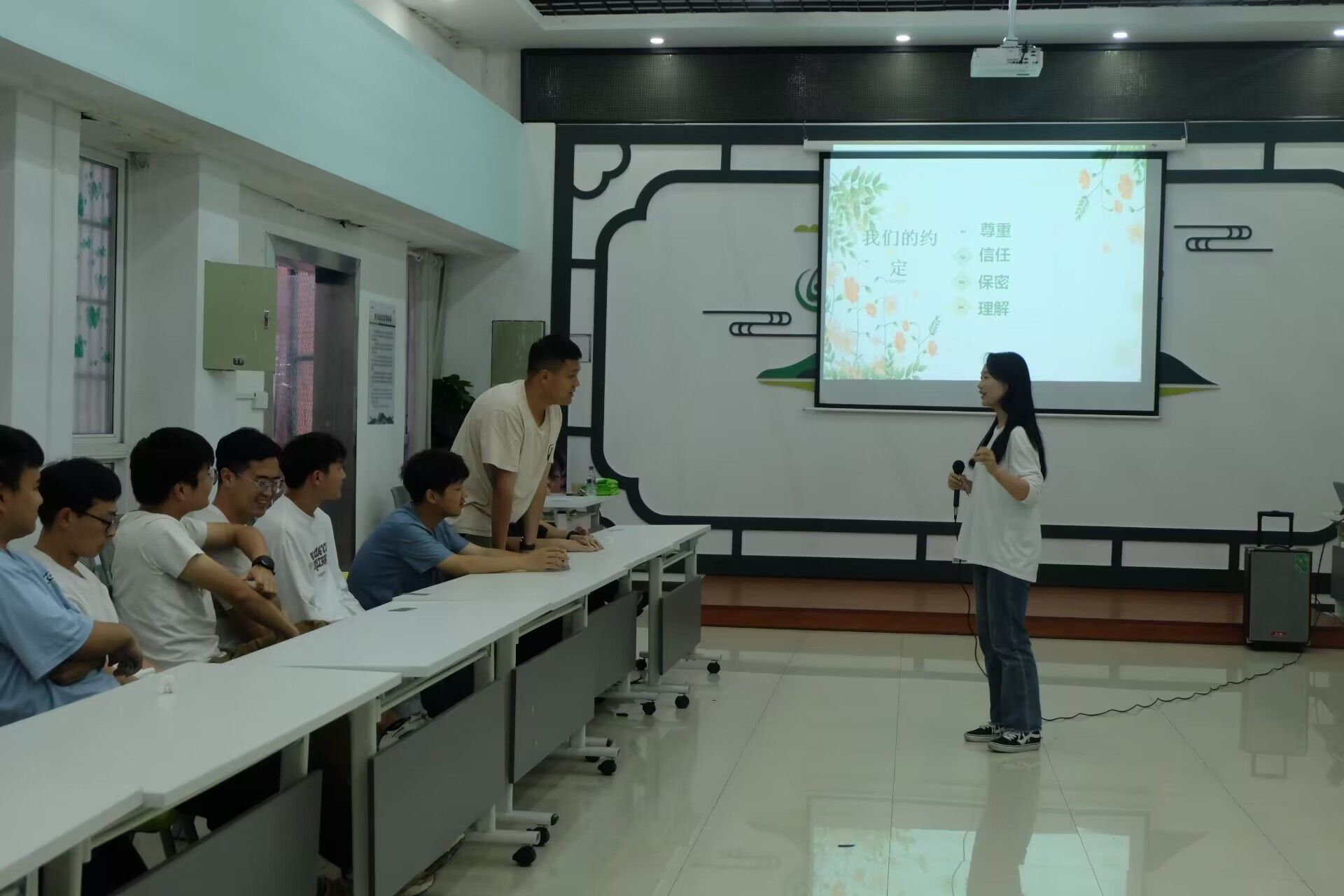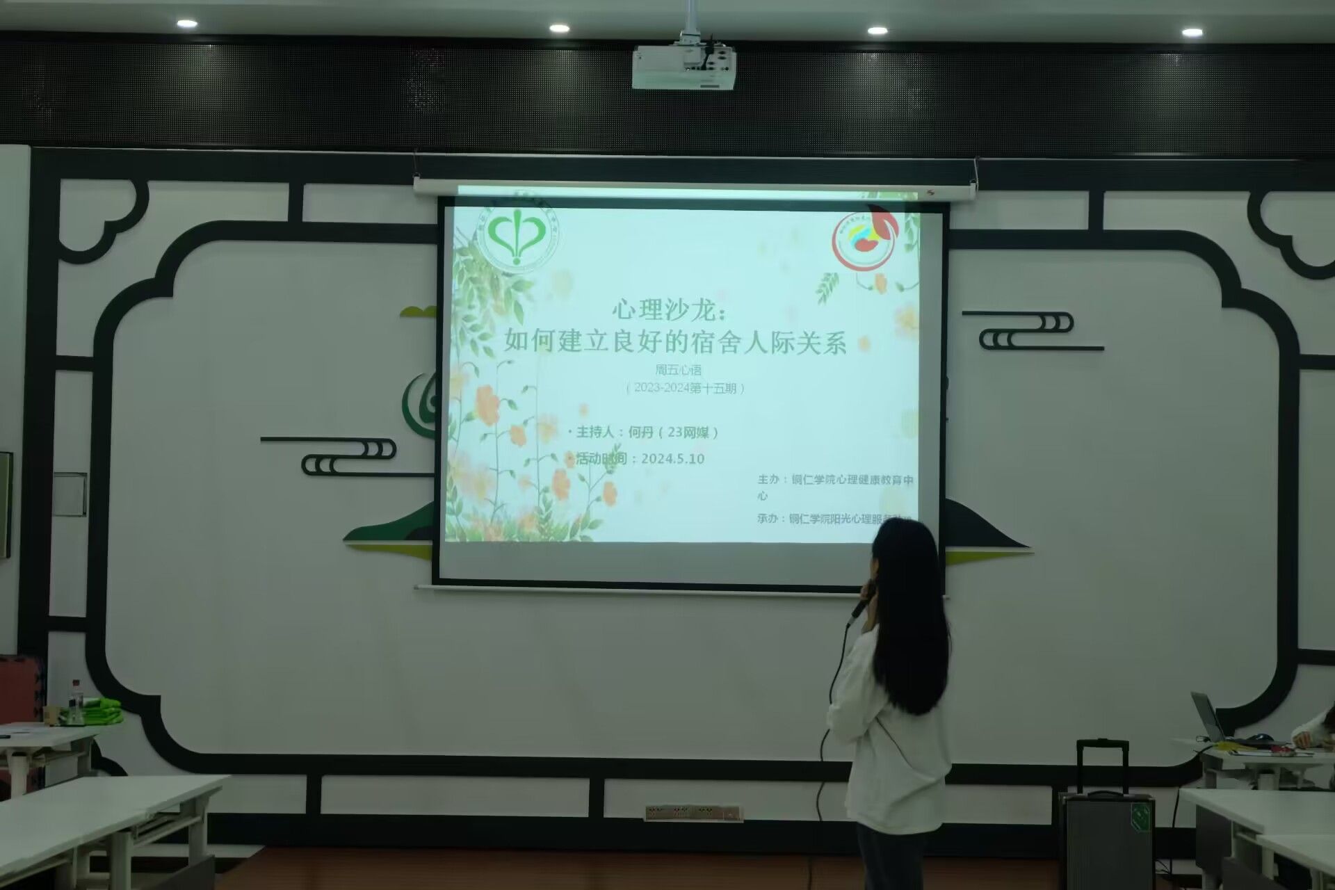 5月10日晚,beat365官网心理健康教育中心在多功能室开展了2023-2024学年第十五期周五心语活动一一心理沙龙之“如何建立良好的宿舍人际关系”。此次活动由2023级网络与新媒体班何丹同学主持分享,共有40名来自不同学院的同学参与。