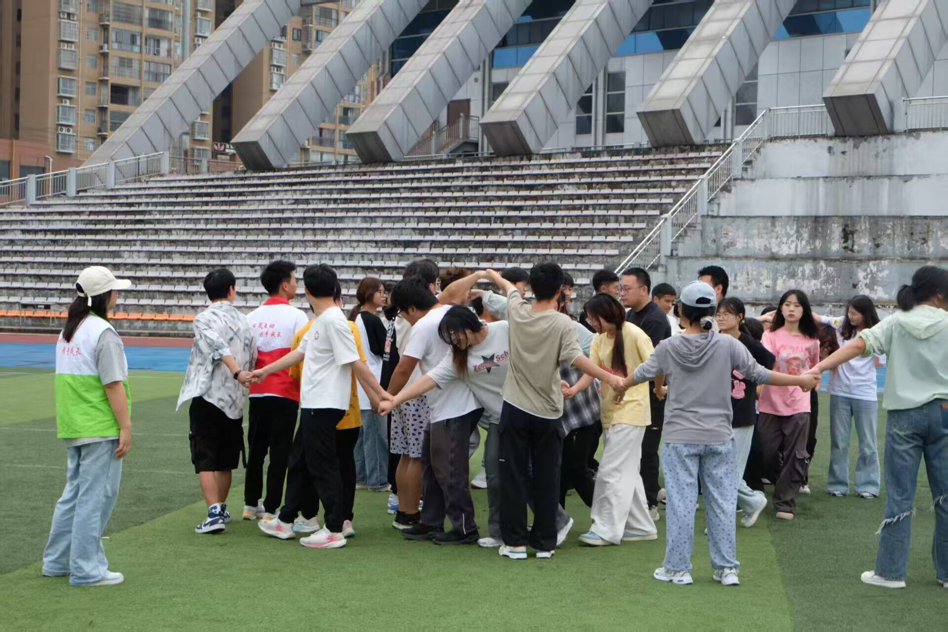 在“同心圆”环节,四个小组分别围成一个“同心圆”车轮,组员之间手拉手分别沿着不同的线滚动,以先到达终点为胜。在奔跑过程中,大家深刻体会到团队协作中保持队形与控制速度的重要性,如同齿轮般紧密配合,缺一不可。这一活动通过肢体接触迅速打破成员间的陌生感,为彼此信任奠定基础。
