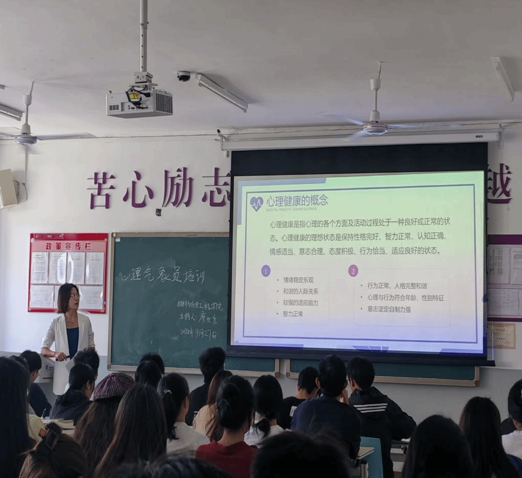 培训中,廖老师通过案例分析与互动交流,讲解心理健康的重要性、常见心理问题的表现及应对方法。并强调心理委员和心理气象员在班级和寝室管理工作中的关键作用,即要善于观察、倾听与关心同学,传授沟通与疏导技巧,鼓励营造良好的氛围。随后,廖老师还向同学们展示该院上学年工作成果及所获奖项,以此激发同学们在工作中的信心与动力。同学们认真听讲、积极互动,培训结束后都表示收获满满。