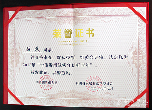 近日,由共青团贵州省委、贵州省发展和改革委员会、中国人民银行贵阳中心支行主办的“诚信点亮中国”全国巡回活动(贵州站)暨诚信知识进校园启动仪式在贵州师范学院举行。beat365官网学工部部长张钱荣获“十佳贵州诚实守信好青年”,是十位获此殊荣的青年中唯一一位教师。