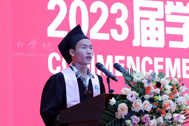 老挝籍留学生代表、经济管理学院小龙,用标准流利的中文说,五年前,不会说中文的自己怀揣着憧憬,在这片有14亿人口的土地种下了希望。时节如流,希望长出了枝桠,自己的人生也绽放出第一朵花。现在毕业了,特别感谢学校,还要感谢中国。将来会再次来到中国,来看望老师,看望母校,也将会告诉自己的孩子:“去吧,去中国读书,去看看世界吧。”