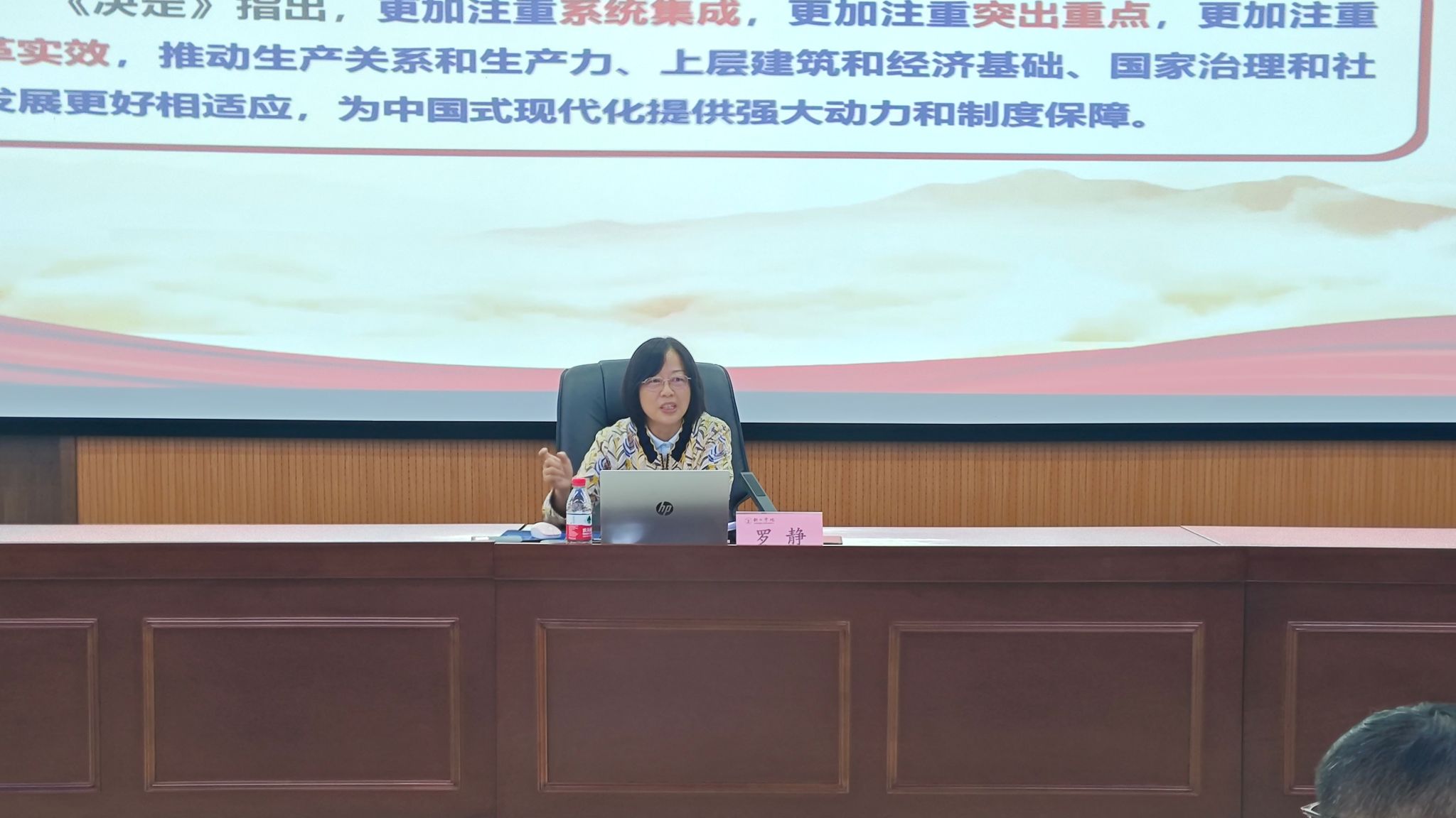 罗静从深刻认识党的二十届三中全会的主题和意义,深刻认识进一步全面深化改革的指导思想、总目标和重大原则,全面准确理解《决定》提出的进一步全面深化改革重大举措,深入学习贯彻党的二十届三中全会精神积极投身学生工作改革创新实践4个方面,带领与会人员深入学习了党的二十届三中全会精神。帮助大家更加深入、系统地领会了党的二十届三中全会精神,并将理论学习与工作实践相结合,启发大家思考如何在“学懂、弄通、做实”上下功夫,如何在学校的学生工作中进行改革创新探索。