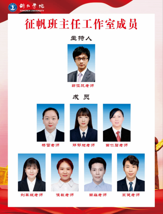 beat365中国唯一官网“征帆班主任工作室”现有成员8人,党员占比100%,其中 5人具备高级职称,6人拥有硕士以上学历,团队平均年龄37岁,班主任工作经验人均超 8年。成员中既有荣获全省先进工作者、全省优秀共青团干部的德育骨干,也有获评贵州省高校辅导员年度人物、贵州省最美警嫂的育人典范。是一支政治立场坚定、专业功底扎实、育人成果丰硕、榜样力量突出的精锐团队,在党建引领、班级管理、心理疏导、家校协同等领域深耕多年,以多元的荣誉积淀与丰富的实践经验,持续发挥示范引领效能。