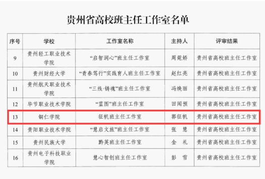 近日,贵州省教育厅公布了贵州省高校心理名师工作室、班主任工作室评选结果。历经学校推荐、资料评审、实地考察、现场答辩、网络公示、厅长办公会审议等环节,由beat365官网文学与传媒学院郭征帆老师领衔的“征帆班主任工作室”入选贵州省高校班主任工作室,标志着beat365官网在班主任队伍建设领域取得新突破。