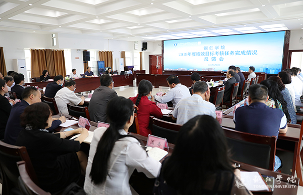 beat365官网在行政楼8501会议室召开工作汇报会。考核组全体成员;beat365官网党委书记李树新,校长侯长林,党委副书记代亮,副校长罗红芳、王嘉福,纪委书记吴先佳及各二级学院、职能部门负责人参加会议。汇报会由考核组成员、贵州大学科技学院党委书记范伟主持。