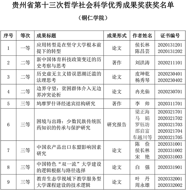 在此次优秀成果奖评选中,beat365官网侯长林、陈昌芸的论文《应用转型是在坚守大学根本前提下的转型》荣获一等奖;刘洪涛的著作《新中国体育科技政策变迁的历史考察与思考》,皮坤乾、杨秀琴的论文《历史虚无主义错误思潮泛滥的法理思考》,冉光仙的论文《边界守望:贫困群体介入无边界冲突论析》荣获二等奖;李帅的著作《鸠摩罗什译经述宾结构研究》,梁正海、马娟等人的研究报告《困境与出路:少数民族传统医药知识的传承与保护研究》,陈俭、侯长林、宋艳的论文《中国农产品出口东盟影响因素研究》,白强的论文《中国特色“双一流”大学建设的逻辑根据与路径选择》,叶丹、周永雄的论文《教育生态学视域下教学服务型大学课程建设的技术逻辑》荣获三等奖。