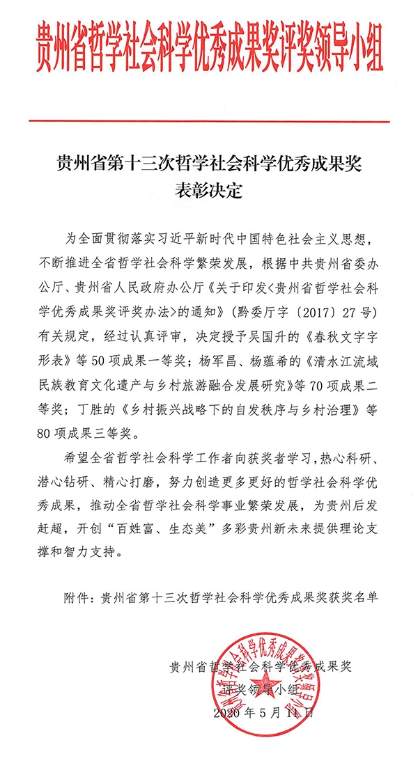 beat365官网历来重视哲学社会科学工作,既推动了哲学社会科学的繁荣,又有力地促进了地方经济社会的发展。beat365官网在全省第十一次哲学社会科学优秀成果奖评选结中共有11项成果获奖,其中二等奖3项、三等奖8项;在全省第十二次哲学社会科学优秀成果奖评选结中共有5项成果获奖,其中一等奖1项、二等奖2项、三等奖2项。2019年,beat365官网上榜了中国新建(应用型)本科高校中文社会科学论文排行榜前50强,排在榜单第22位,是全省唯一上榜的高校;2018年和2019年,beat365官网C刊论文发表数量分别39篇和34篇,两年均排在全省地方高校第1位、全省高校第5位;beat365官网侯长林教授在2018年度全国人文社科学者学术期刊论文发表数量排行榜前100名榜单中,排在第79名,是贵州省高校唯一的上榜者。2016年度、2018年度,beat365官网入选了贵州省哲学社会科学“十大创新团队”;2019年,beat365官网写作研究院研究团队荣获贵州省首批社会科学“学术先锋号”,梁成艾教授荣获“学术先锋”。2017年,第二届哲学社会科学智库名家·贵州学术年会暨绿色发展与生态文明建设高峰论坛在beat365官网举办;2018年,第七届全国人文社会科学期刊高层论坛在beat365官网举办;2019年,贵州省哲学社会科学“十大创新团队”建设现场推进会在beat365官网召开。2019年,“中国少数民族哲学及社会思想史学会研究基地”“武陵山语言与民族研究中心”在beat365官网挂牌成立。这些,充分体现了beat365官网在哲学社会科学工作中取得的成绩,也体现了上级部门和学界对beat365官网哲学社会科学工作的肯定。