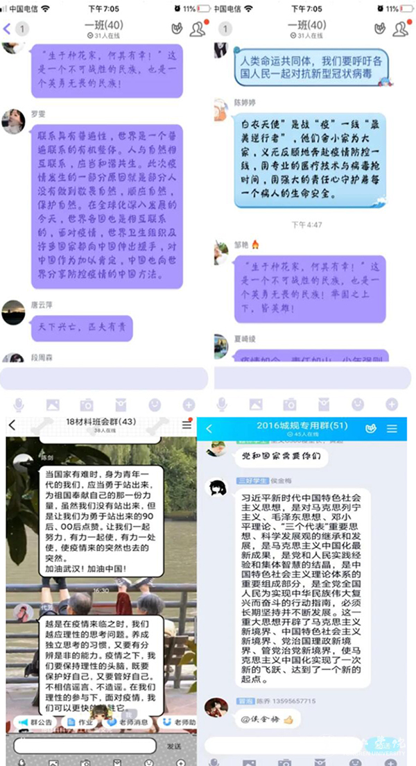 经济管理学院学生戢吟涛说:“青年一代有理想、有本领、有担当,国家就有前途,民族就有希望。作为新生代力量,此时此刻,就是大学生为国家为民族为人民服务的重要契机,这场特殊时期的思政课给予了我信心和力量,我们都要从力所能及的小事做起,勇于担当有所作为,团结起来守护好我们的祖国和人民。”