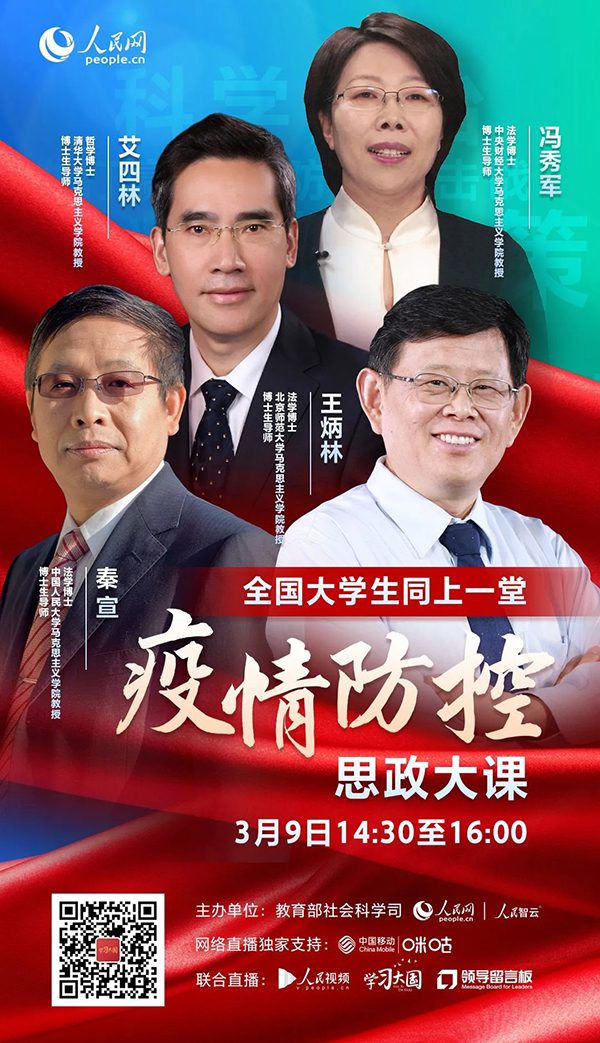 此次直播课,邀请了清华大学马克思主义学院艾四林、中国人民大学马克思主义学院秦宣、北京师范大学马克思主义学院王炳林、中央财经大学马克思主义学院冯秀军4位教授进行讲授。直播过程中,艾四林教授立足中国抗击疫情的具体实践,引导学生深化对马克思主义基本理论的认识、深化对马克思主义中国化最新成果的认识。秦宣教授聚焦“疫情大考告诉我们什么?”分析中国抗疫彰显的中国共产党领导和中国特色社会主义制度的显著优势。王炳林教授从我国历史上的防疫斗争历程出发,分享从磨难中奋起、化危机为转机的历史经验和智慧。冯秀军教授以战“疫”里的青年责任与担当为主题,讲述这场疫情中勇敢逆行的年轻风景,引导大学生群体担当历史使命,将青春梦想扎根祖国的广袤大地。
