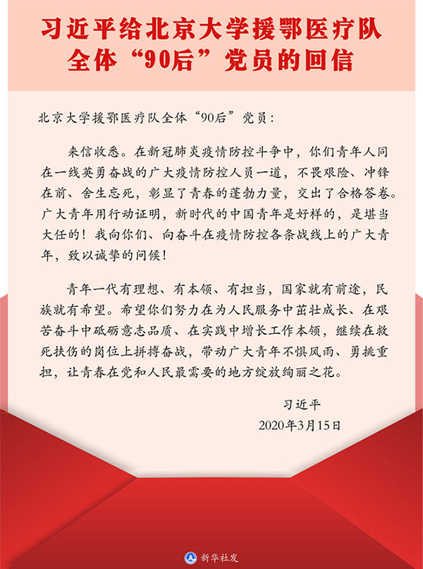 习近平总书记3月15日给北京大学援鄂医疗队全体“90后”党员回信,向他们和奋斗在疫情防控各条战线上的广大青年致以诚挚的问候。