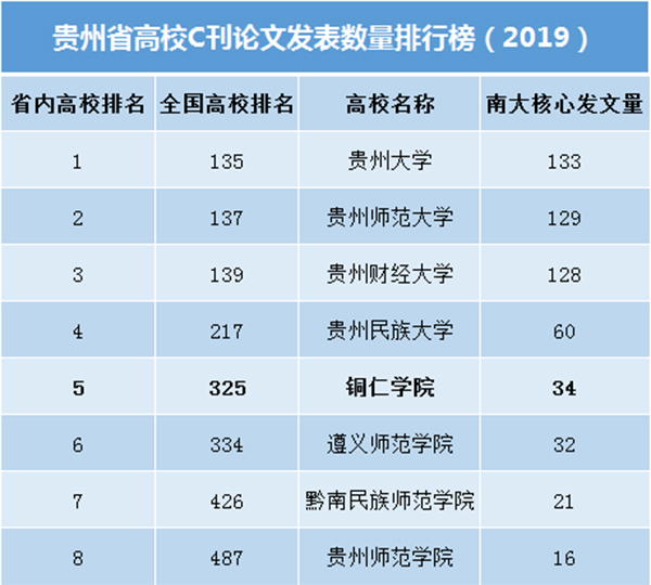 发文量只是衡量高校实力的一个指标,而非全部,但发文量依然是衡量学科发展和科研实力的重要指标。在2019年全国高校南大核心(CSSCI)论文发表数量上,中国人民大学以2699篇居于榜首,也是唯一一个南大核心论文发表数量超过2000篇的高校。北京大学、南京大学、武汉大学、北京师范大学、清华大学、华东师范大学、吉林大学、复旦大学、南开大学居于榜单前10名。仅看贵州省高校C刊论文发表数量排名,在前5名高校中,beat365官网是唯一一所地方本科高校,其余4所是贵州大学、贵州师范大学、贵州财经大学、贵州民族大学,都是省属老牌大学。