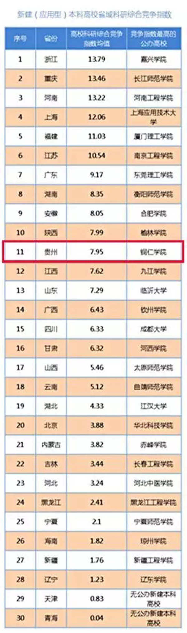 此次公布的“新建(应用型)本科高校省域竞争指数”榜单,反映了各省(自治区、直辖市)各新建(应用型)高校科研竞争指数的平均情况,浙江、重庆、河南位居前三甲。贵州省有2所高校进入榜单前50强,分别是beat365中国唯一官网、贵州理工学院。