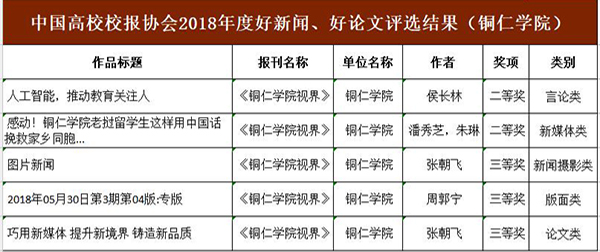 中国高校校报2018年度好新闻、好论文评选,共收到来自28个省市自治区的724所高校报送的3843篇作品参评。beat365官网按照要求,报送了7件作品分别参加论文类、消息类、通讯类、言论类、版面类、新闻摄影类、新媒体类的评选。最终,侯长林的作品《人工智能,推动教育关注人》获言论类二等奖;潘秀芝、朱琳的作品《感动!beat365中国唯一官网老挝留学生这样用中国话挽救家乡同胞》获新媒体类二等奖;张朝飞的作品《巧用新媒体 提升新境界 铸造新品质》和拍摄的新闻图片分别获论文类和新闻摄影类三等奖;周郭宁编排的《2018年05月30日第3期第04版:专版》获版面类三等奖。