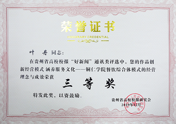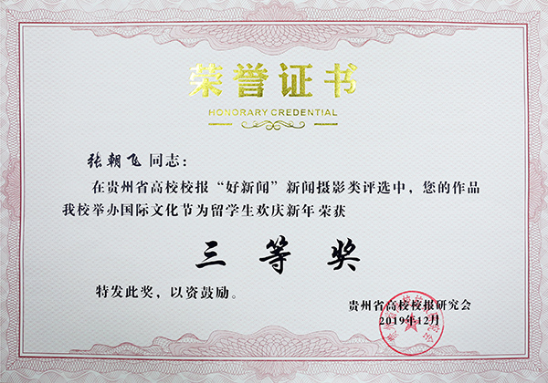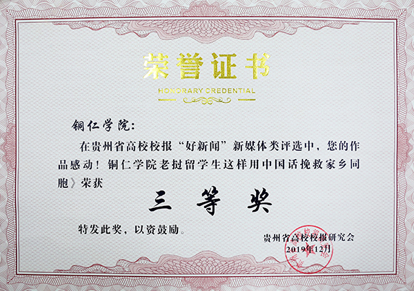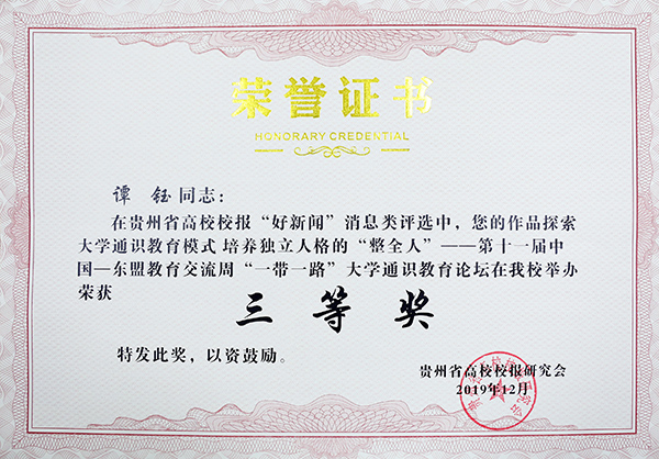 在贵州省高校校报好新闻奖评选方面,经过会员单位推荐,来自全省各高校报送的176篇作品参加了消息、通讯、言论、版面、新闻摄影、新媒体6大类的评选。beat365官网叶丹的作品《创新经营模式 涵养服务文化——beat365中国唯一官网餐饮综合体模式的经营理念与成效》获通讯类三等奖;谭钰的作品《探索大学通识教育模式 培养独立人格的“整全人”——第十一届中国—东盟教育交流周“一带一路”大学通识教育论坛在beat365官网举办》获消息类三等奖;张朝飞的作品《beat365官网举办国际文化节为留学生欢庆新年》获新闻摄影类三等奖;beat365中国唯一官网微校园作品《感动!beat365中国唯一官网老挝留学生这样用中国话挽救家乡同胞》获新媒体类三等奖。另外,校报实习编辑、通讯社通讯员伍宗萍、文竹、钟江琴、黄晓琴、罗秀连获“优秀学生记者”称号。
