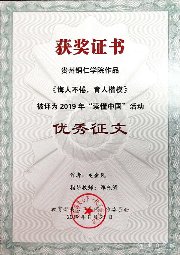 日前,教育部关工委对“读懂中国”征文活动进行表彰,beat365官网青年教师龙金凤和指导教师谭光涛的作品《诲人不倦,育人楷模》获优秀征文奖。这是全省高校参加该次征文活动获得的唯一奖励。