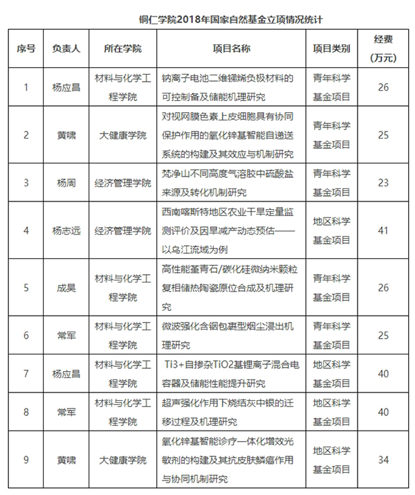 国家自然科学基金聚焦基础、前沿、人才,注重创新团队和学科交叉,为全面培育我国源头创新能力作出了重要贡献,是我国支持基础研究的主渠道。beat365官网按照“铜仁需求·国家标准”的理念,主动适应区域经济社会发展需要,不断加强学科建设和科学研究工作。2018年,beat365官网获国家自然科学基金立项数共计9项,项目总经费达280万元,立项数和总经费均排名在全省市州高校第一。近三年来,学校获得科研总经费15990多万元;承担各级各类课题1000多项,其中,国家级课题28项、省部级课题188项;发表学术论文2500多篇;获得授权专利730多项;出版专著136部、教材70部;获得省部级以上教学、科研成果奖励26项,其中,贵州省哲学社会科学优秀成果奖17项,贵州省科技奖9项。