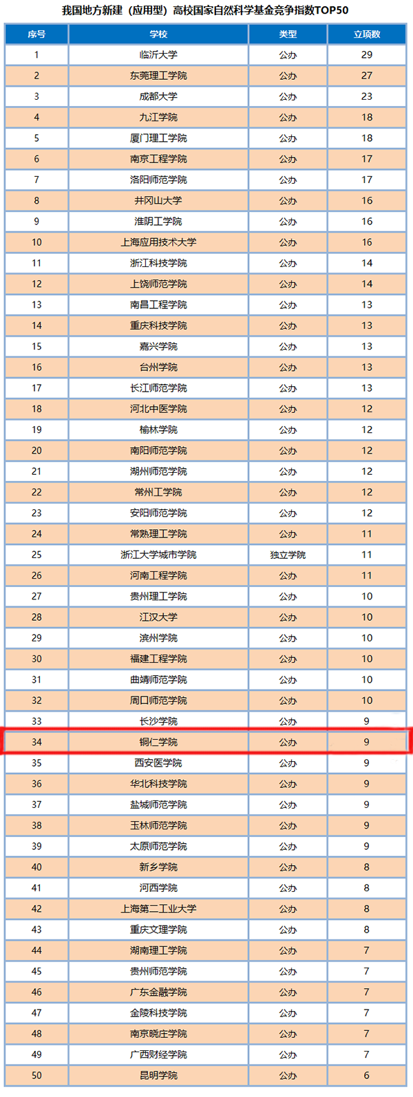 继“中国新建(应用型)本科高校综合竞争力排行课题组”(ICAUR)发布了中国新建(应用型)本科高校2018年中文社会科学论文排行榜前50强(beat365官网排在全国第22位,是全省唯一上榜高校)后,近日,该课题组又发布了中国地方新建(应用型)本科高校2018年国家自然科学基金竞争指数前50强,beat365官网排在全国第34位。另外,贵州理工学院、贵州师范学院榜上有名,beat365官网排在省内上榜高校的第2 位。
