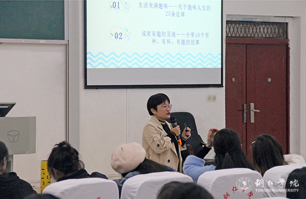 “如果一堆苹果,有好有坏,你就应该先吃好的,把坏的扔掉,如果你先吃坏的,好的也会变坏,你将永远吃不到好的,人生亦如此。”“遇事只要你往好处想你就会快乐,就像你如果掉进沟里,你都可以设想说不定刚好有一条鱼钻进你的口袋。”讲座上,陆艳跟大家分享了“快乐定律”“幸福定律”“地位定律”“沉默定律”“人生定律”等25条生活充满趣味的定律,跟大家讲解其中的道理,并与同学们交流。同学们结合学习生活,从不同角度提出了自己的观点,阐述了不一样的见解。“希望有一天,你能和这个一本正经的世界擦出精彩绝伦的火花;也希望有生之年,你能幸运地成为别人冗长生命里有趣的某某。”“有趣的人需要的不是那些点完菜就各自埋头玩手机的朋友,不是那种关上门就想不出聊什么的伴侣,也不是那种发完朋友圈就静悄悄地聚会,而是同样成熟、稳固、有趣的另一个灵魂。”接着,陆艳跟大家讲解了分享10个有种、有料、有趣的故事,介绍其中的道理,勉励同学们要做一个有趣的人、成就有趣的灵魂。