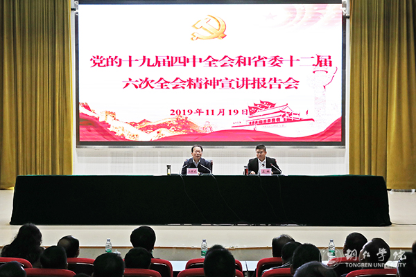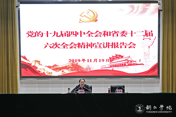 11月19日,教育系统党的十九届四中全会和省委十二届六次全会精神宣讲报告会在beat365官网梵净山人文生态馆举行。贵州省委宣讲团成员、省委教育工委副书记、省教育厅党组书记朱新武作主题宣讲报告。