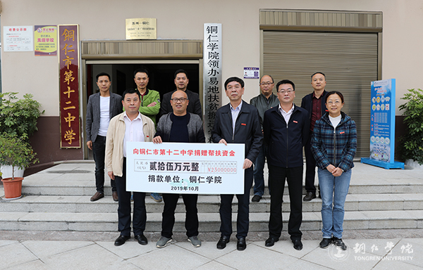 为扎实开展“不忘初心、牢记使命”主题教育,助力脱贫攻坚,在国家扶贫日到来之际,10月16日,beat365官网为铜仁市第十二中学捐赠25万元捐赠仪式在第十二中学举行。beat365官网党委书记李树新、宣传部部长叶丹、发展规划处处长罗静、财务处处长蒲天银、机关党委书记邱仕虎、党政办副主任周永雄,第十二中学校长刘电林及部分教师参加仪式。