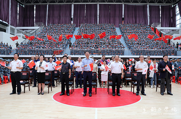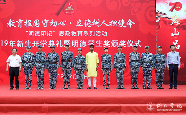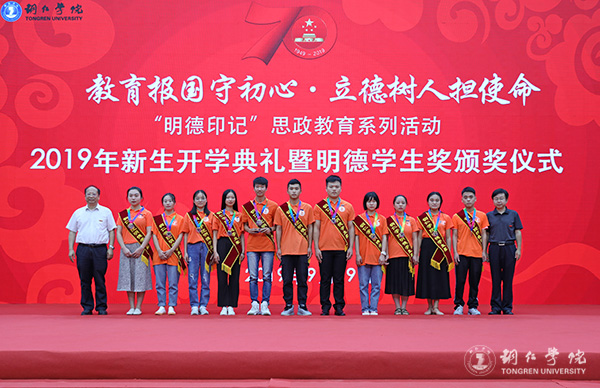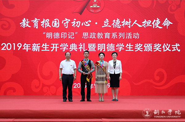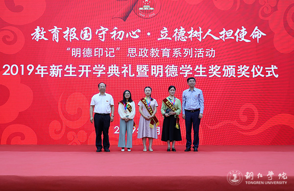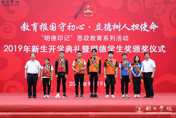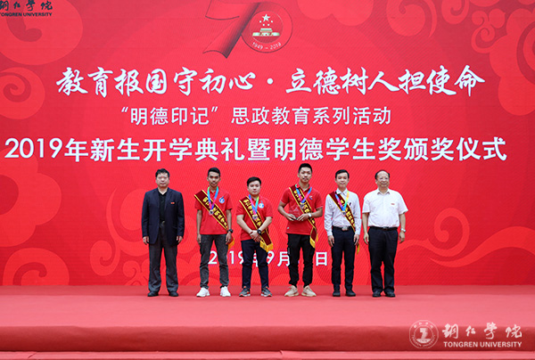 9月19日,beat365官网2019年新生开学典礼暨明德学生奖颁奖典礼在体育馆举行。党委书记李树新,校长侯长林,党委副书记饶小华,副校长代亮、罗红芳、王嘉福,纪委书记吴先佳出席典礼并为获奖者颁奖。各二级学院领导、各部门主要负责人,2019级全体新生,以及明德学生奖获奖者参加了典礼。典礼由学工部部长张钱主持。